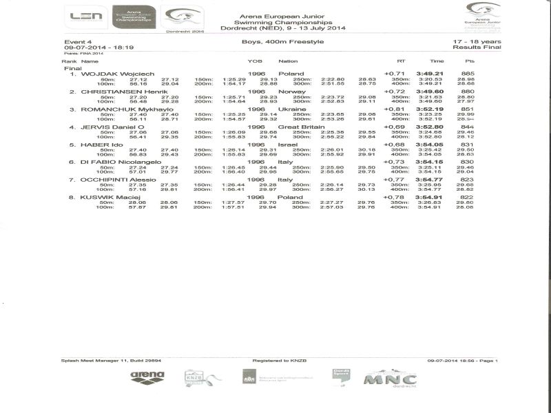 Na dystansie 400 metrów uzyskał czas 3.49,21, ustanawiając nowy rekord Polski juniorów 18-letnich. Wyprzedził Norwega Henrika Christiansena (3.49,60) oraz Ukraińca Michała Romaczuka (3.52,19). Wojtek poprawił o dwie sekundy wynik, który nie tak dawno w seniorskich mistrzostwach Polski dał mu srebrny medal.