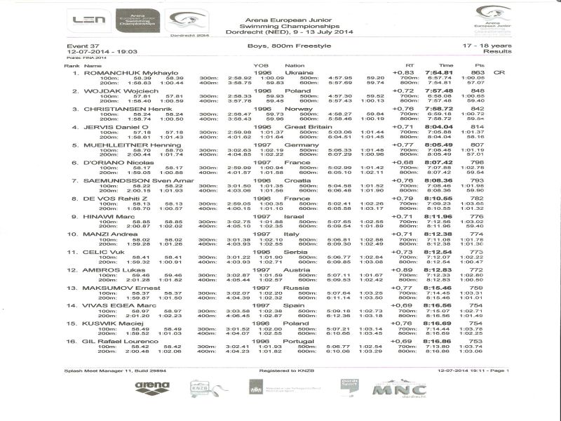 W sobotę (13 lipca) Wojtek wykorzystał kolejną szansę, zdobywając srebrny medal na dystansie 800 metrów tym samym stylem z czasem 7:57.48. Do tak znakomitych wyników dołożył 4. miejsce na 1500 m stylem dowolnym (15.19,92) .