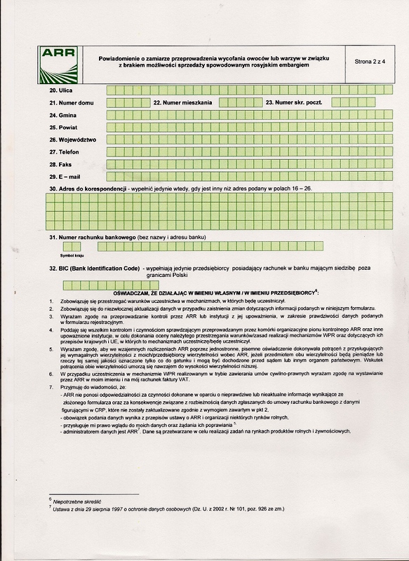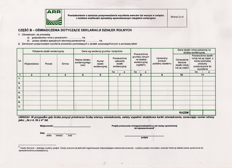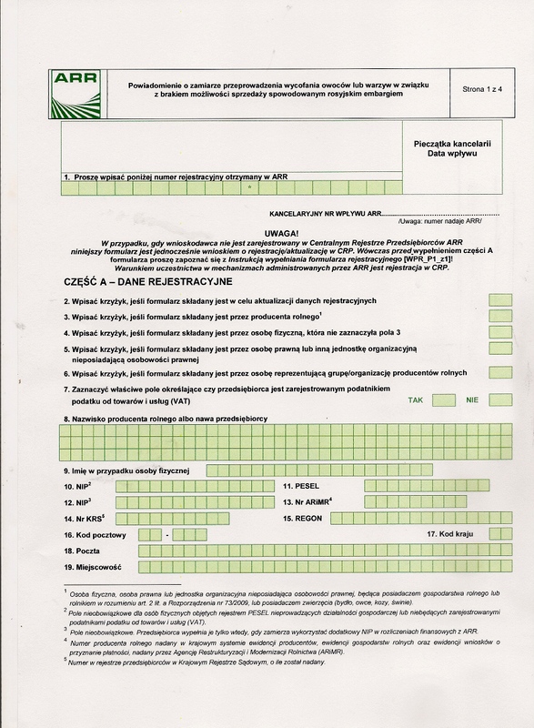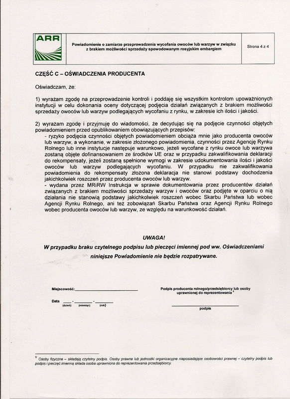 W związku z wprowadzeniem embarga przez Federację Rosyjską producent owoców i warzyw, który ma zamiar wycofać określony produkt z rynku powinien złożyć stosowne powiadomienie na piśmie do Oddziału Terenowego Agencji Rynku Rolnego w Krakowie na druku zamieszczonym na stronie w/w Agencji ( link w załączeniu).Informacji na ten temat oraz pomocy przy wypełnianiu powiadomienia udzielają pracownicy Małopolskiego Ośrodka Doradztwa.http://arr.gov.pl/index.php?option=com_content&view=article&id=3304:arr-przyjmuje-powiadomienia-od-rolnikow-poszkodowanych-embargo&catid=379&Itemid=1114
