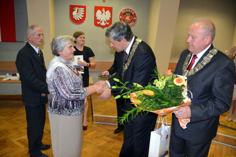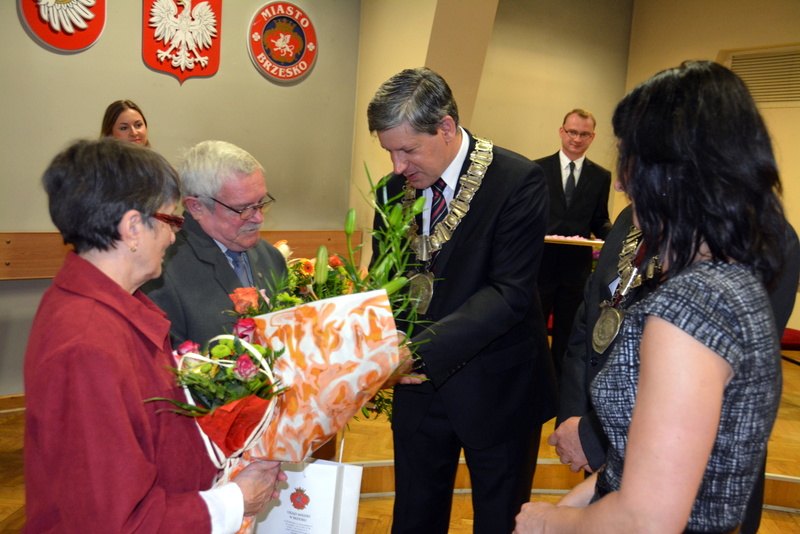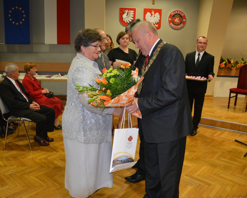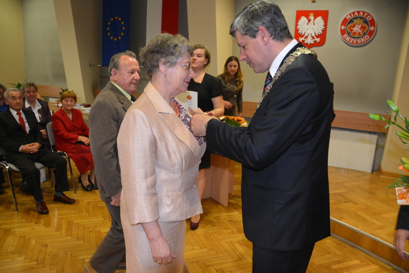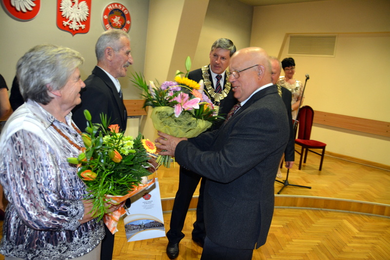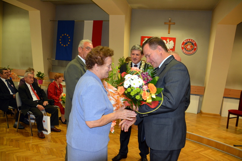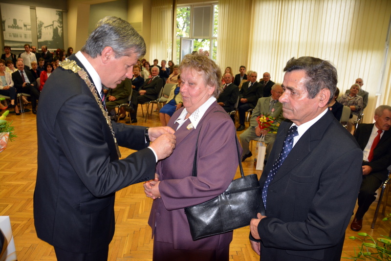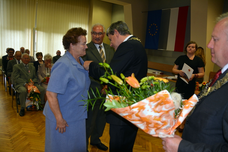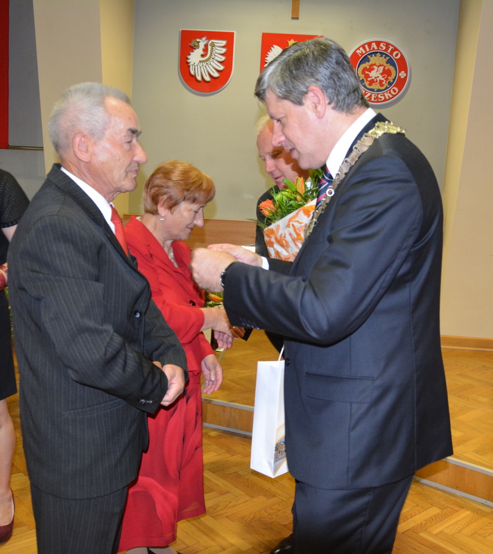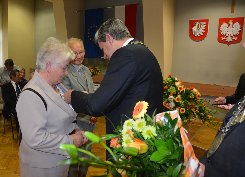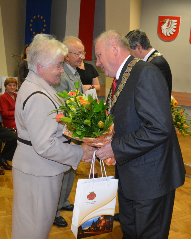 Wyjątkowa atmosfera towarzyszyła spotkaniu w Urzędzie Miejskim - 23 pary małżeńskie świętowały jubileusz 50-lecia.Wyjątkowych gości oraz ich najbliższych podejmował burmistrz Grzegorz Wawryka, mając zaszczyt wręczenia im w imieniu Prezydenta RP medali oraz listów gratulacyjnych za długoletnie pożycie małżeńskie. Aktu dekoracji dokonał wspólnie z przewodniczącym Rady Miejskiej Tadeuszem Pasierbem.Wasza obecność tutaj świadczy o tym, że wypełniliście przysięgę małżeńską, w której zobowiązaliście się iść razem przez życie i nieść sobie pomoc w dobrej, czy złej godzinie. Wraz z wami ten zaszczytny jubileusz świętują dzisiaj wasi bliscy: dzieci wnuki, prawnuki, najbliższa rodzina, oraz znajomi – ich wszystkich serdecznie witamy. Tymi słowami przywitała wszystkich kierowniczka Urzędu Stanu Cywilnego, Aleksandra Fijałkowska.Dostojni jubilaci, pozwólcie, że z tej niezwykłej okazji wspaniałego jubileuszu waszego pożycia małżeńskiego, złożę wam najserdeczniejsze gratulacje za chlubne przebycie tak pięknej i długiej wspólnej drogi życia oraz za ogrom pracy i serdecznych uczuć włożonych w dobre wychowanie dzieci. Za ofiarną miłość, przykład życia, cierpienia i łez radości, noce nieprzespane, słowa otuchy. Myślę, że jest to dla was wielki dzień radości – mówił burmistrz Brzeska.Do życzeń dołączyli się przewodniczący osiedli i sołtysi sołectw, w których mieszkają jubilaci – Katarzyna Pacewicz Pyrek, Maria Kądziołka, Anna Lubowiecka, Marek Kośmider i Józef Witek.W tym roku złote gody obchodzi 70 par małżeńskich. Jest toszczególny moment, który przeżywamy i mamy okazję cieszyć się ze wspaniałego jubileuszu, dorobku życia wielu brzeszczan, którzy na przestrzeni tych 50 lat, tworzyli rodzinę, budowali Brzesko i jego przyszłość.Cała uroczystość oprawiona była występem w wykonaniu uczniów Szkoły Muzycznej, młodzieży Miejskiego Ośrodka Kultury oraz występem zespołu Krakowiaków Ziemi Brzeskiej.BP/fot. Marek Kotfis