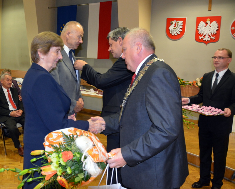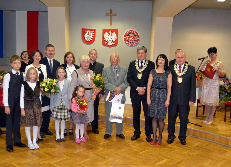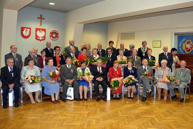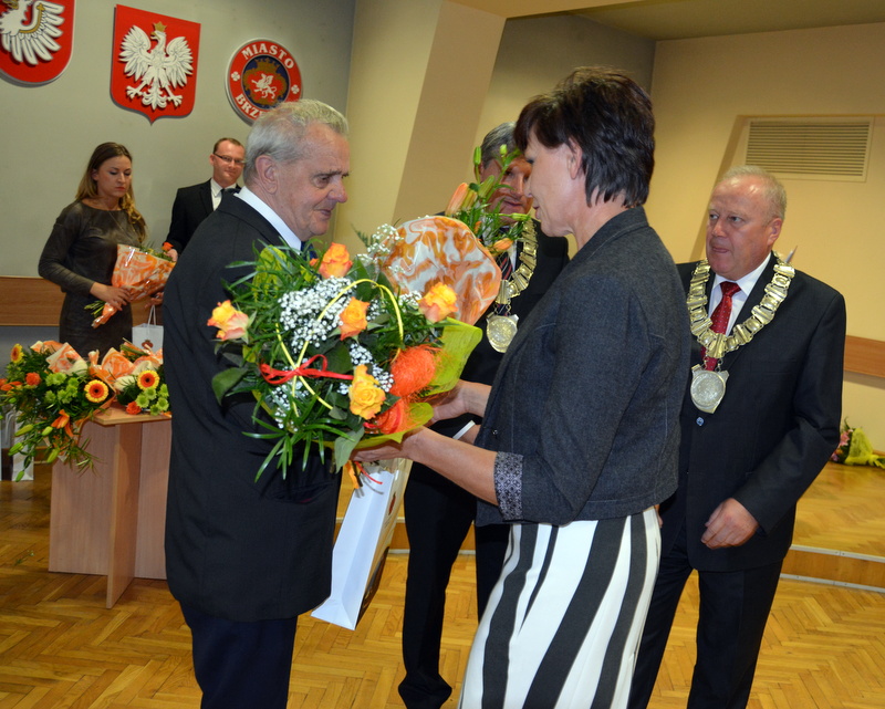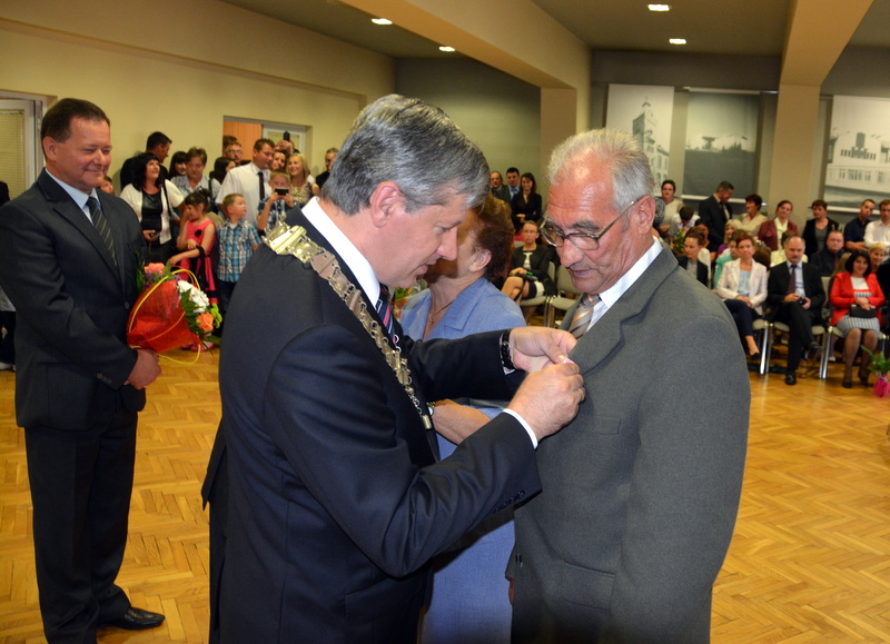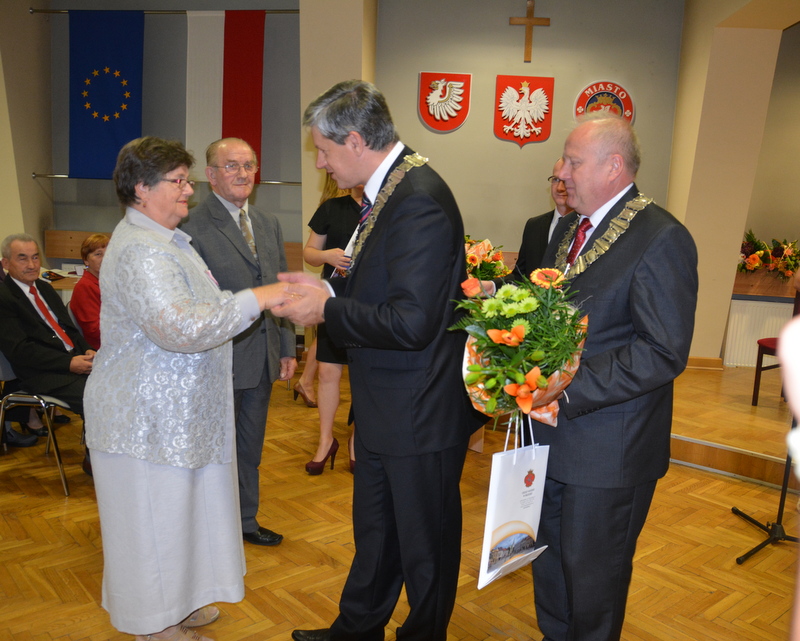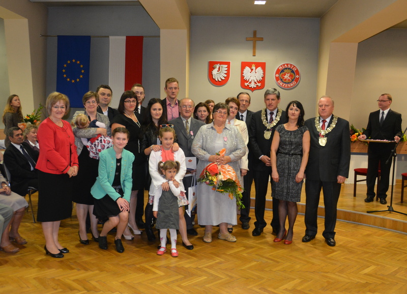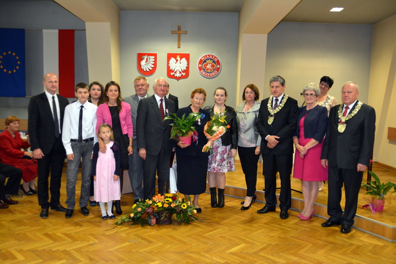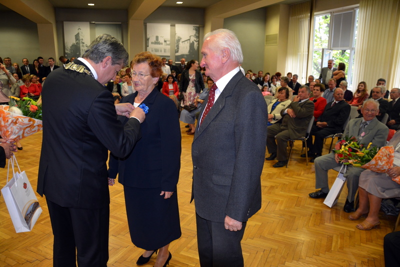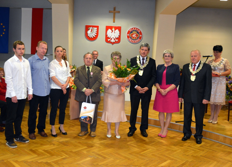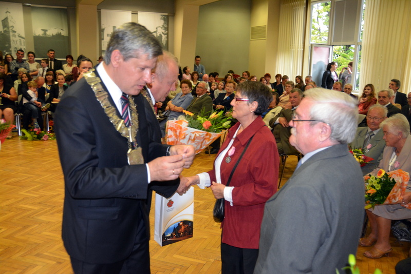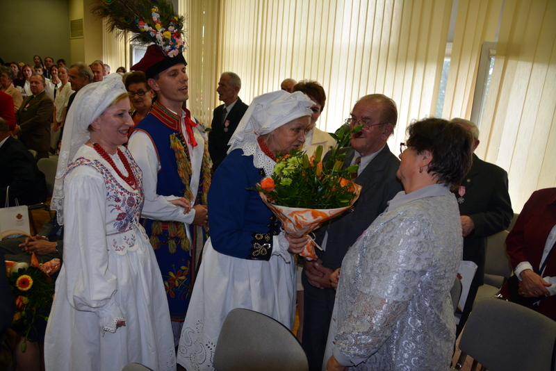 Wyjątkowa atmosfera towarzyszyła spotkaniu w Urzędzie Miejskim - 23 pary małżeńskie świętowały jubileusz 50-lecia.Wyjątkowych gości oraz ich najbliższych podejmował burmistrz Grzegorz Wawryka, mając zaszczyt wręczenia im w imieniu Prezydenta RP medali oraz listów gratulacyjnych za długoletnie pożycie małżeńskie. Aktu dekoracji dokonał wspólnie z przewodniczącym Rady Miejskiej Tadeuszem Pasierbem.Wasza obecność tutaj świadczy o tym, że wypełniliście przysięgę małżeńską, w której zobowiązaliście się iść razem przez życie i nieść sobie pomoc w dobrej, czy złej godzinie. Wraz z wami ten zaszczytny jubileusz świętują dzisiaj wasi bliscy: dzieci wnuki, prawnuki, najbliższa rodzina, oraz znajomi – ich wszystkich serdecznie witamy. Tymi słowami przywitała wszystkich kierowniczka Urzędu Stanu Cywilnego, Aleksandra Fijałkowska.Dostojni jubilaci, pozwólcie, że z tej niezwykłej okazji wspaniałego jubileuszu waszego pożycia małżeńskiego, złożę wam najserdeczniejsze gratulacje za chlubne przebycie tak pięknej i długiej wspólnej drogi życia oraz za ogrom pracy i serdecznych uczuć włożonych w dobre wychowanie dzieci. Za ofiarną miłość, przykład życia, cierpienia i łez radości, noce nieprzespane, słowa otuchy. Myślę, że jest to dla was wielki dzień radości – mówił burmistrz Brzeska.Do życzeń dołączyli się przewodniczący osiedli i sołtysi sołectw, w których mieszkają jubilaci – Katarzyna Pacewicz Pyrek, Maria Kądziołka, Anna Lubowiecka, Marek Kośmider i Józef Witek.W tym roku złote gody obchodzi 70 par małżeńskich. Jest toszczególny moment, który przeżywamy i mamy okazję cieszyć się ze wspaniałego jubileuszu, dorobku życia wielu brzeszczan, którzy na przestrzeni tych 50 lat, tworzyli rodzinę, budowali Brzesko i jego przyszłość.Cała uroczystość oprawiona była występem w wykonaniu uczniów Szkoły Muzycznej, młodzieży Miejskiego Ośrodka Kultury oraz występem zespołu Krakowiaków Ziemi Brzeskiej.BP/fot. Marek Kotfis