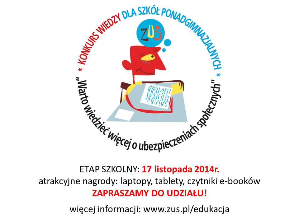 Ogólnopolski konkurs wiedzy "Warto wiedzieć więcej o ubezpieczeniach społecznych" szansą na atrakcyjne nagrody multimedialne dla uczniów i szkół.Trzyetapowy konkurs jest skierowany do uczniów szkół ponadgimnazjalnych biorących udział w projekcie edukacyjnym "Lekcje z ZUS". Uczniowie zgłaszają się do rywalizacji za pośrednictwem szkoły, w której się uczą. Pierwszy, szkolny etap konkursu odbędzie się 17 listopada 2014 roku. Daje to placówkom jeszcze szanse na przystąpienie do projektu, przeprowadzenie czterech lekcji o tematyce z zakresu ubezpieczeń społecznych i zgłoszenie uczniów do udziału w konkursie. Najlepsze zespoły wezmą udział w etapie wojewódzkim w marcu przyszłego roku. Finał na poziomie centralnym jest przewidziany na kwiecień. Nagrodami w konkursie są laptopy, tablety i czytniki e-booków.Celem nadrzędnym „Lekcji z ZUS’ jest poszerzenie wiedzy o ubezpieczeniach społecznych. Uczniowie zdobywają praktyczne informacje o emeryturach, rentach i innych świadczeniach przysługujących osobom ubezpieczonym oraz szereg wskazówek jak zarejestrować własną firmę i z jakimi zobowiązaniami wobec ZUS się to wiąże. Program lekcji wpisuje się w ramy obowiązującej Postawy Programowej, rozwijając wskazane w niej zagadnienia.Więcej informacji o projekcie oraz konkursie można znaleźć na podstronie internetowej www.zus.pl/edukacja.Zapraszamy do udziału!