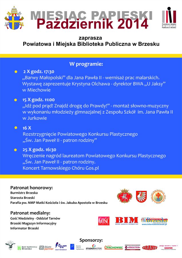 Powiatowa i Miejska Biblioteka Publiczna zaprasza na obchody Miesiąca Papieskiego. Szczegóły na plakacie.