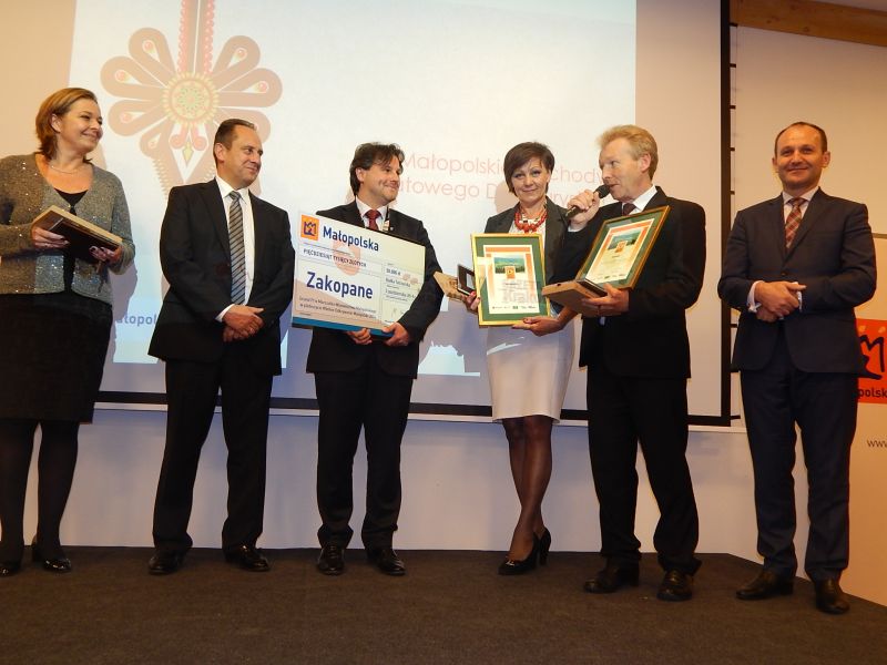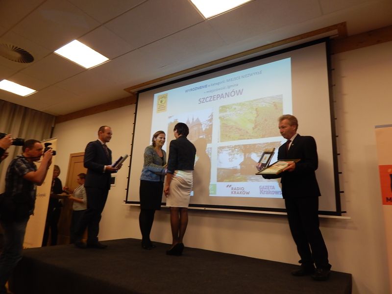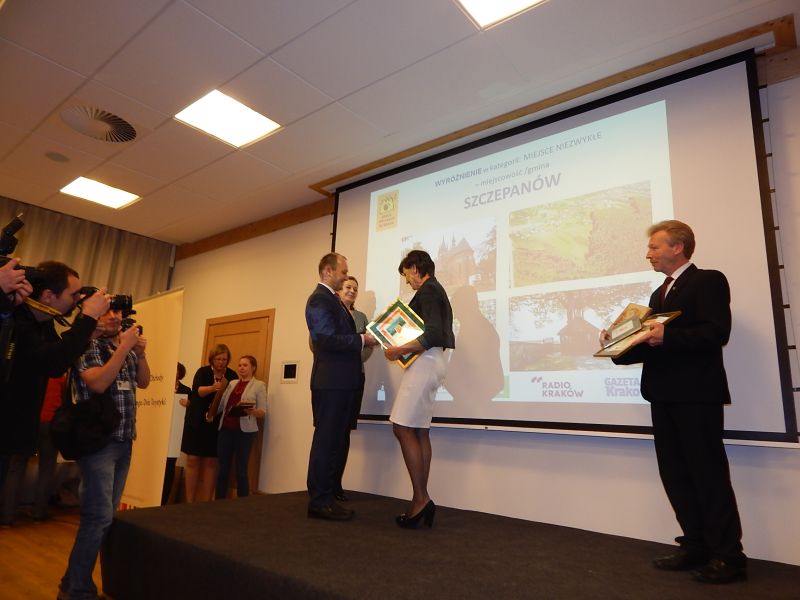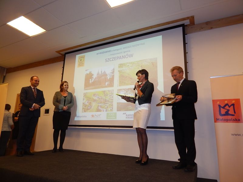 W ramach Małopolskich Obchodów Światowego Dnia Turystyki w piątek, 3 października w Białce Tatrzańskiej odbyła się finałowa gala XV edycji plebiscytu "Gazety Krakowskiej" i Urzędu Marszałkowskiego w Krakowie - "Wielkie Odkrywanie Małopolski". Gospodarzem imprezy była Białka Tatrzańska – laureat ubiegłorocznej edycji plebiscytu. W Sali konferencyjnej nowoczesnego hotelu Bania zebrali się przedstawiciele branży turystycznej, krakowskiej prasy i telewizji, oraz samorządowców z marszałkiem Małopolski Markiem Sową.Plebiscyt rozstrzygany był w siedmiu kategoriach, ale najważniejszą wśród nich była kategoria „Miejsca niezwykłe” – miejscowość/gmina, w której wyróżnienie trafiło do Szczepanowa i jako sołtys miałam zaszczyt odebrać je z rąk Marszałka. Dla nas ogromny to zaszczyt i wyróżnienie. Szczepanów nie jest dużą miejscowością, bo liczącą około 950 mieszkańców, ale jest rzeczywiście miejscem niezwykłym. Bogatą 1000 – letnią historię zawdzięcza św. Stanisławowi Biskupowi i Męczennikowi, którego postać nierozerwalnie związana jest z historią miejscowości. Należy w tym miejscu podkreślić, iż ogromną zasługę w szerzeniu kultu naszego rodaka, a tym samym rozsławianiu Szczepanowa ma ks. prałat Władysław Pasiut, proboszcz szczepanowskiej parafii. Odbierając wyróżnienie zachęciłam wszystkich do odwiedzania Szczepanowa i pięknych zakątków ziemi brzeskiej.Drugie wyróżnienie trafiło do gminy Zielonki pod Krakowem, nazywanej do niedawna sypialnią Krakowa. Wygrało Zakopane – zimowa stolica Polski. Prócz dyplomu przedstawiciel Zakopanego otrzymał czek na 50 tys. zł.Program gali wypełnił występ regionalnego zespołu dziecięcego „Mali Białcanie”.Muszę również wspomnieć, iż Marszałek dokonał okolicznościowego wpisu do szczepanowskiej kroniki. Napisał w niej: „Serdeczne gratuluję wyróżnienia w konkursie Wielkie Odkrywanie Małopolski w 2014 roku. W Małopolsce przywiązujemy ogromną wagę do dziedzictwa duchowego naszego regionu. Mieszkańcy Szczepanowa, jak mało kto potrafią troszczyć się o zachowanie swojej tożsamości pod patronatem św. Stanisława Biskupa, patrona naszego kraju i mojej diecezji. Marek Sowa Marszałek Małopolski”.Pragnę serdecznie podziękować wszystkim tym, którzy oddali swój głos na Szczepanów wysyłając SMS-y, czy kupony zamieszczone w wersji papierowej lub e-wydaniu "Gazety Krakowskiej".Relację z uroczystej gali można zobaczyć na stronie internetowej „Gazety Krakowskiej” -http://www.gazetakrakowska.pl/artykul/3596377,wielkie-odkrywanie-malopolski-gala-finalowa-w-bialce-zdjecia,id,t.htmlSołtys Szczepanowa Anna Lubowiecka