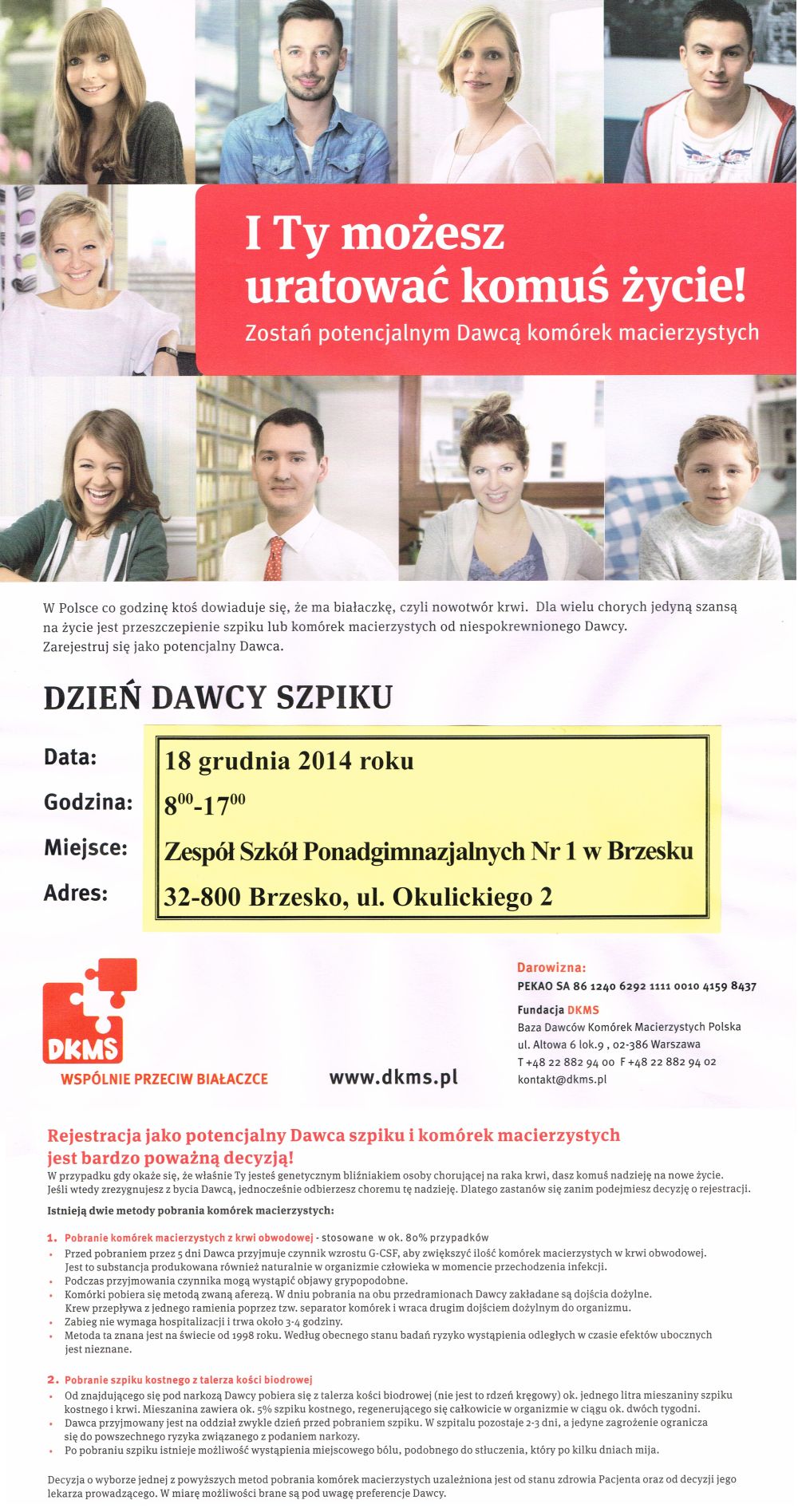 W Polsce, co godzinę stawiana jest komuś diagnoza: nowotwór krwi, czyli białaczka. Dla wielu pacjentów jedyną szansą na wyzdrowienie jest przeszczepienie szpiku od dawcy niespokrewnionego. Cały czas są w Polsce pacjenci, dla których nie znaleziono dawcy, wśród 22 milionów osób zarejestrowanych na całym świecie. By zwiększyć szansę na znalezienie dawcy dla pacjentów organizujemy Dzień Dawcy Szpiku w Brzesku.