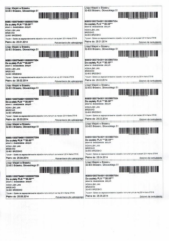 Biuro Gospodarki Odpadami Urzędu Miejskiego w Brzesku, uprzejmie informuje, że w celu ułatwienia mieszkańcom gminy Brzesko wnoszenie opłat za odbiór odpadów komunalnych z nieruchomości, opracowane zostały nowe druki wpłat.Druk wpłat dzieli się na blankiety z podziałem na poszczególne miesiące roku (od stycznia do czerwca), określające miesięczną kwotę wpłat, indywidualny numer rachunku bankowego, datę wniesienia opłaty, oraz potwierdzenia dla wpłacającego. Nowe druki wpłat zostaną w miesiącu styczniu 2015 roku dostarczone do każdego gospodarstwa domowego za pośrednictwem Poczty Polskiej.Jednocześnie przypominamy, że nie uległy zmianie indywidualne rachunki bankowe, które zostały przesłane Państwu poprzednio, dlatego w przypadku nie otrzymania blankietów przed terminem płatności tj. 25 stycznia 2015 roku, mieszkańcy nie są zwolnieni z obowiązku dokonania wpłaty. Wpłaty za pomocą blankietów dokonywane w Krakowskim Banku Spółdzielczym są zwolnione z opłat bankowych.