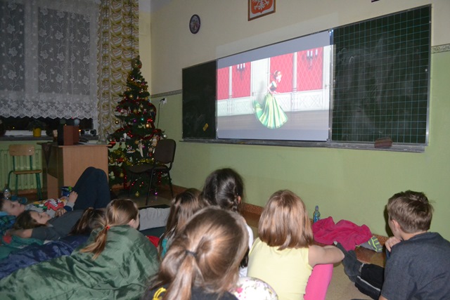 Już około godziny 18.30 zaczęli zbierać się pierwsi „filmożercy”. Wtedy też zaczęto porządkować sale i przygotowywać się do projekcji. Porozkładano materace, karimaty i śpiwory. Uczestnicy wydarzenia nie zapomnieli również o swoich ulubionych maskotkach i wygodnych poduszkach , które umiliły spędzenie tej niezwykłej nocy. Punktualnie o 19 .30 w trzech salach rozpoczęły się projekcje filmów wybranych przez uczniów. Głównie dominowały przeboje ostatnich lat, takie jak „Hobbit”, „Kraina lodu” czy „Harry Potter”. Uczestnicy filmowej nocy mogli swobodnie przemieszczać się między salami i wybierać interesujące ich pozycje. Wyświetlanie filmów było przewidziane aż do rana, jednak nawet najwytrwalszych „filmożerców” prędzej czy później dopadł sen, a około godziny 5 cichutkie chrapanie dochodziło już z wszystkich sal. Po całej nocy odbyło się gremialne, małe sprzątanie i porządkowanie klas. Był także czas na wymianę wrażeń i uwag na temat obejrzanych filmów i samego pomysłu nocy filmowej.