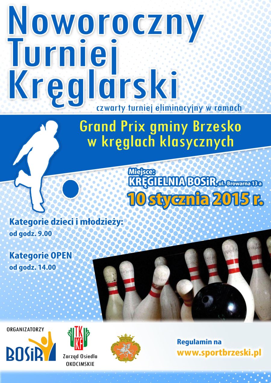 Serdecznie zapraszamy miłośników kręgli klasycznych do udziału w Noworocznym Turnieju Kręglarskim, który odbędzie się w najbliższą sobotę 10 stycznia na Kręgielni BOSiR w Brzesku. Będzie to czwarty ostatni turniej eliminacyjny w ramach cyklu Grand Prix Gminy Brzesko w kręglach klasycznych.Startujemy o godz. 9.00 od kategorii dzieci i młodzieży. Natomiast kategorie seniorów rozpoczniemy o godz. 14.00.Grand Prix objęte jest honorowym patronatem Burmistrza Brzeska Grzegorza Wawryki. Organizatorami turnieju są: BOSiR Brzesko, TKKF Sokół Brzesko, UM Brzesko oraz Zarząd Osiedla OKOCIMSKIE.