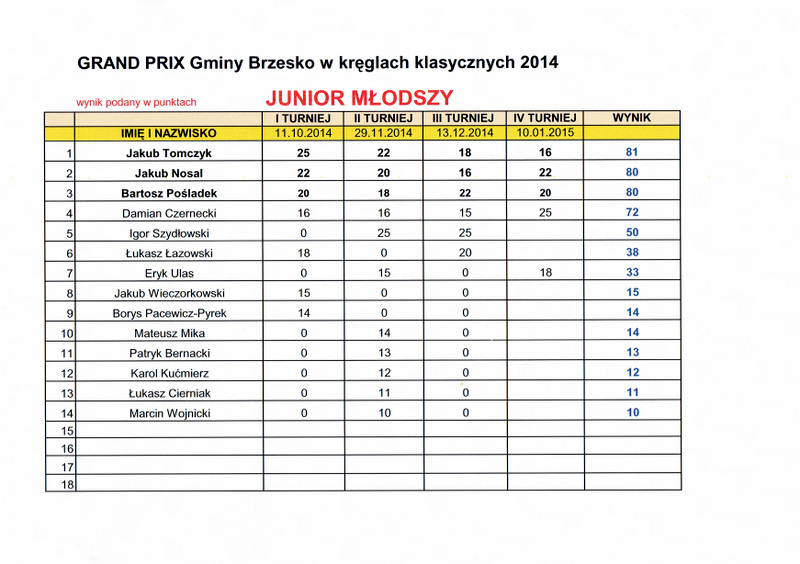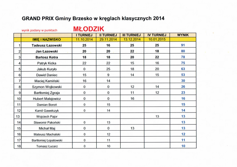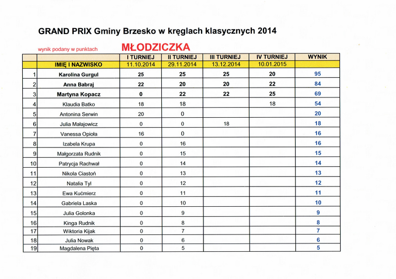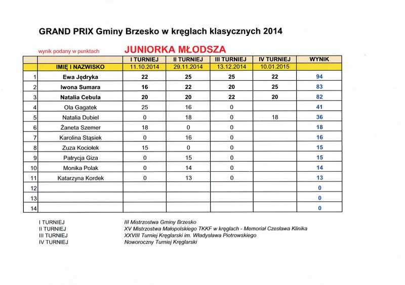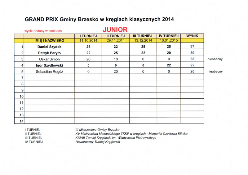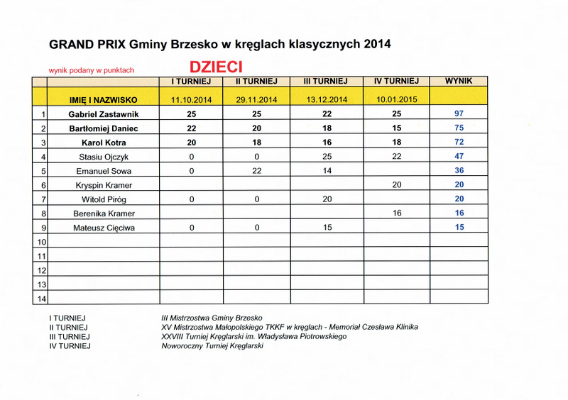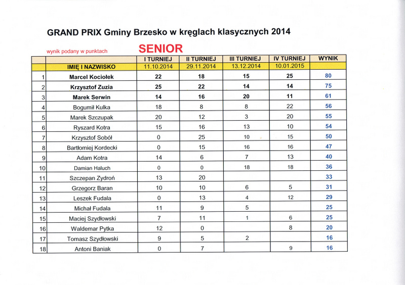 W ostatnim Noworocznym Turnieju wzięło udział 54 zawodników, na którym nastąpiło podliczenie i ogłoszenie wszystkich wyników w dziewięciu kategoriach wiekowych. Dekoracji najlepszych kręglarzy 2014 roku w imieniu Burmistrza oraz dyrektora BOSiR dokonali Przewodniczący Rady Miejskiej w Brzesku Krzysztof Ojczyk oraz Radny Rady Miejskiej Krzysztof Stępak. Wszystkim uczestnikom dziękujemy za liczny udział w zawodach, zwycięzcom gratulujemy oraz dziękujemy wszystkim, którzy mieli swój wkład w organizację całego cyklu GRAND PRIX.