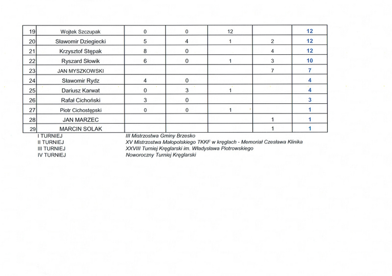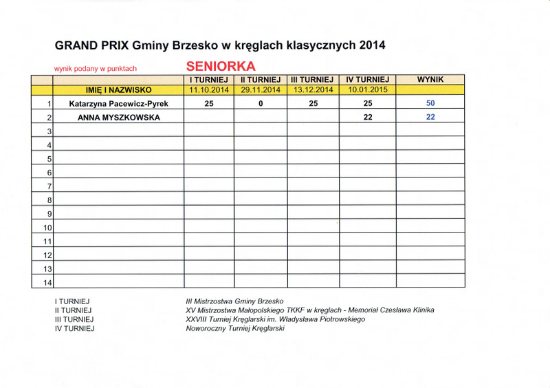W ubiegłą sobotę odbył się Noworoczny Turniej Kręglarski i był to czwarty turniej eliminacyjny w ramach cyklu GRAND PRIX Gminy Brzesko w kręglach klasycznych. Cały cykl składał się z czterech imprez sportowych na kręgielni BOSiR w Brzesku i były to:1. III Mistrzostwa Gminy Brzesko (11.10.2014),2. XV Mistrzostwa Małopolskiego TKKF w kręglach - Memoriał Czesława Klinika (29.11.2014), 3. XXVIII Turniej Kręglarski im. Władysława Piotrowskiego (13.12.2014)4. Noworoczny Turniej Kręglarski (10.01.2015).