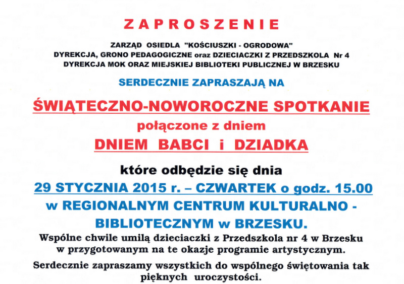 Zarząd Osiedla „Kościuszki – Ogrodowa” wraz z Przedszkolem Nr 4, MOK i Powiatową i Miejską Biblioteką Publiczną zapraszają na świąteczno-noworoczne spotkanie połączone z Dniem Babci i Dziadka. Wspólne chwile umilą dzieciaczki z Przedszkola Nr 4 w Brzesku, które wystąpią w specjalnie przygotowanym na tą okazję programie artystycznym.Zapraszamy do RCKB 29 stycznia (czwartek) na godz. 15.00.