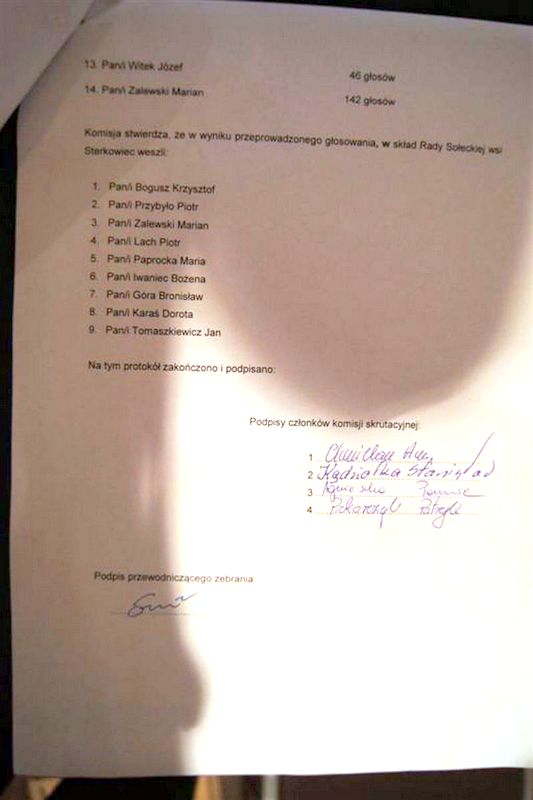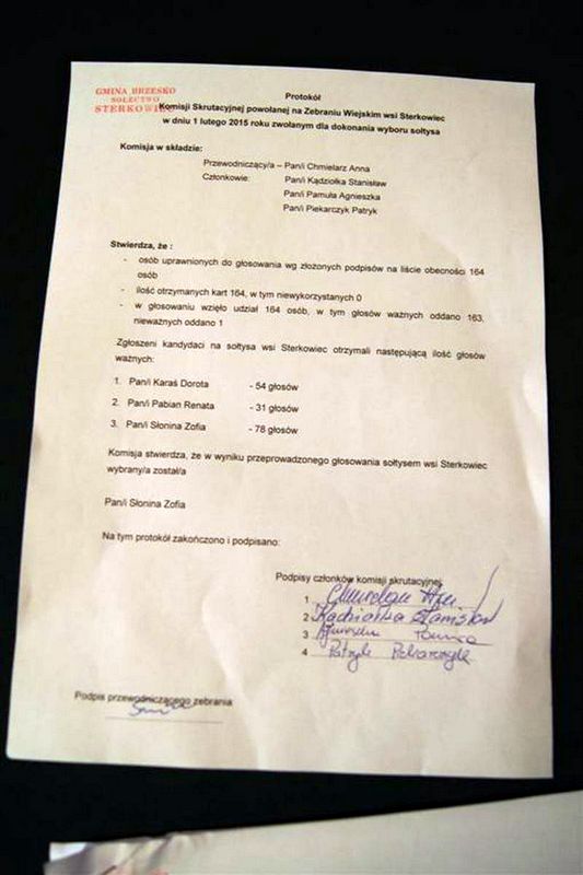 W niedzielę 1 lutego 2015 r. o godz. 12.30 w Domu Kultury w Sterkowcu odbyły się wybory sołtysa oraz rady sołeckiej na kadencję 2015 - 2019. Mieszkańcy Sterkowca przybyli na zebranie wyjątkowo licznie - w wyborach wzięły udział 164 osoby! Tym razem tylko panie zgłosiły swoje kandydatury do funkcji sołtysa wsi Sterkowiec. Ostatecznie największą liczbę głosów zdobyła pani Zofia Słonina.Zgłoszone kandydatki na sołtysa wsi Sterkowiec otrzymały następującą ilość głosów:1. Dorota Karaś - 54 głosy2. Renata Pabian - 31 głosów3. Zofia Słonina - 78 głosówW głosowaniu udział wzięły 164 osoby, w tym głosów ważnych oddano 163, nieważnych 1.Pracę nowej pani sołtys będzie wspierała 9 osobowa rada sołecka w składzie:1. Iwaniec Bożena2. Karaś Dorota3. Paprocka Maria4. Bogusz Krzysztof5. Góra Bronisław6. Lach Piotr7. Przybyło Piotr8. Tomaszkiewicz Jan9. Zalewski Marian W trakcie zebrania sołtys upływającej kadencji - Józef Witek złożył sprawozdanie z realizowanych działań. W zebraniu wzięli udział przedstawiciele władz samorządowych - burmistrz Brzeska Grzegorz Wawryka, zastępca burmistrza Jerzy Tyrkiel, sekretarz Stanisław Sułek, wiceprzewodniczący Rady Powiatu Tomasz Latocha, przewodniczący Rady Miejskiej Krzysztof Ojczyk, wraz radnymi miejskimi - Krzysztofem Stępakiem oraz Krzysztofem Boguszem.Nad prawidłowością głosowania czuwali pracownicy Urzędu Miejskiego w Brzesku, oraz komisja skrutacyjna złożona z mieszkańców Sterkowca.Zebranie sołeckie i liczna reprezentacja mieszkańców były okazją do dyskusji o najbardziej istotnych spraw z punktu widzenia mieszkańców - a więc remontu linii kolejowej, budowy chodników, odśnieżania.Dziękujemy wszystkim, którzy przyszli i oddali swój głos!