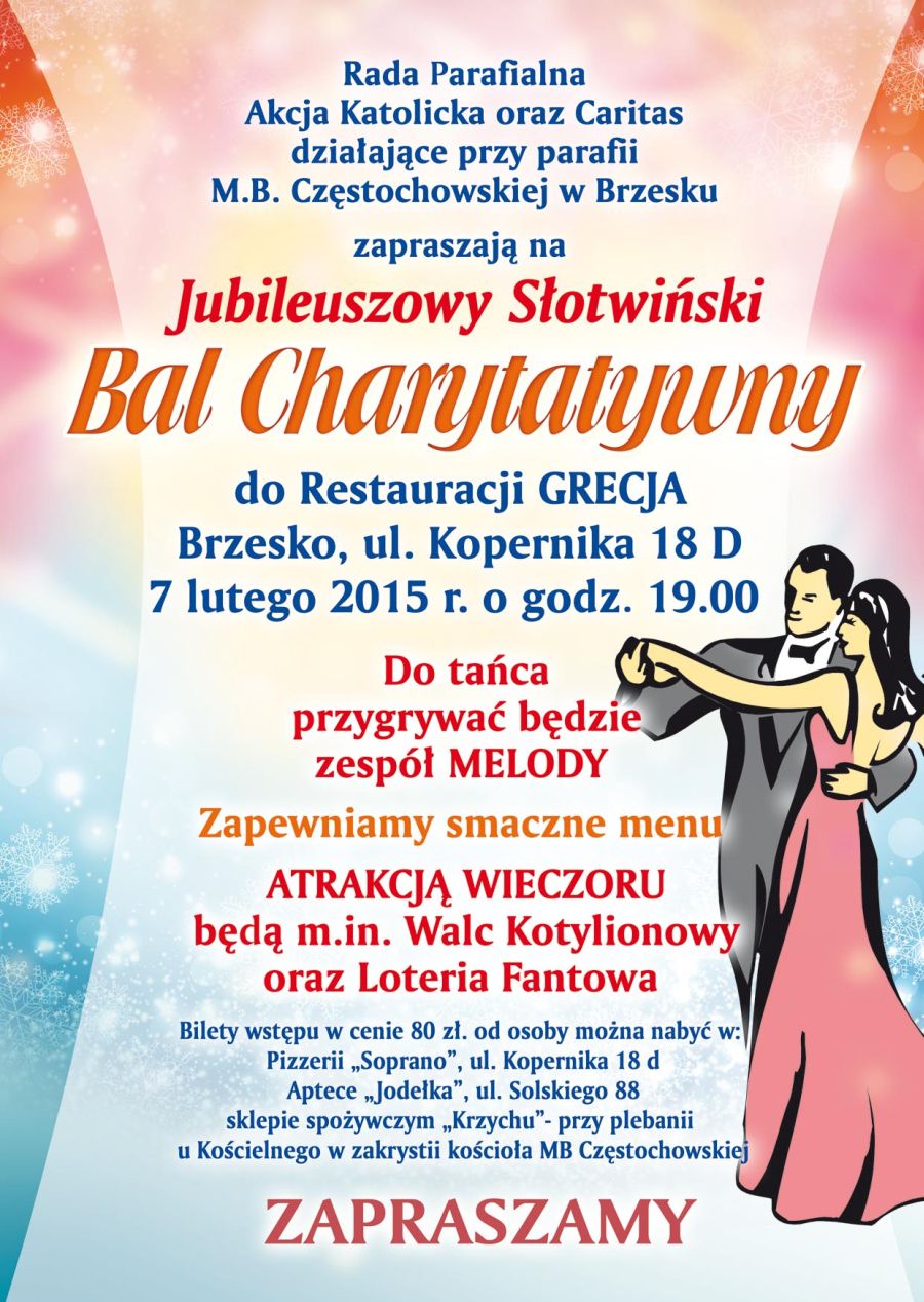 Rada Parafialna, Akcja Katolicka oraz „Caritas” działające przy parafii M.B. Częstochowskiej w Brzesku zapraszają na Jubileuszowy Słotwiński Bal Charytatywny, który odbędzie się 7 lutego w restauracji „Grecja” w Brzesku. Początek godz. 19.00.Szczegóły na plakacie.