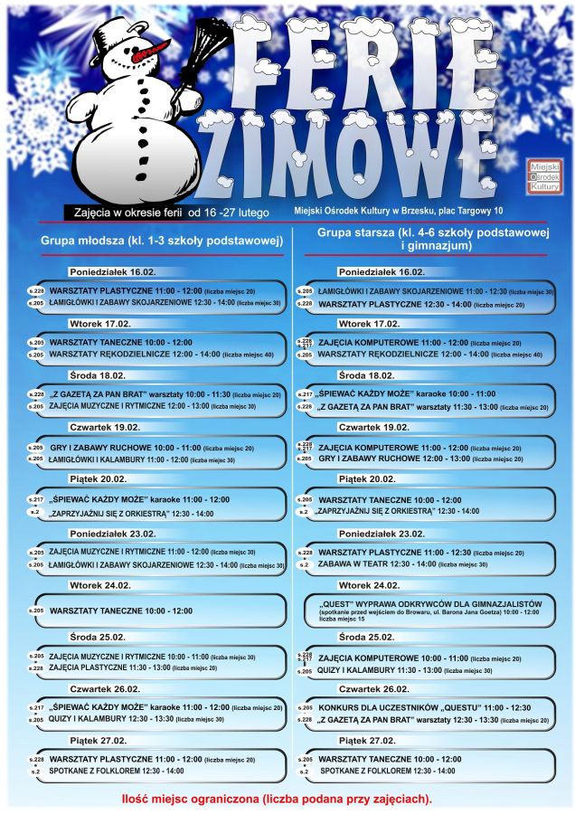 MOK zaprasza dzieci na bezpłatne zajęcia w czasie ferii zimowych. Szczegóły na plakacie