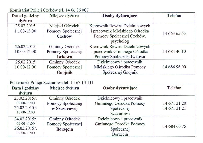 Podobnie jak w latach ubiegłych, w okresie od 23 do 28 lutego 2015 r. Komenda Powiatowa Policji w Brzesku bierze aktywny udział w działaniach w ramach „Tygodnia Pomocy Ofiarom Przestępstw”. W ten sposób Policja chce zwrócić szczególną uwagę na potrzeby i prawa osób pokrzywdzonych w wyniku przestępstwa.Jako że jednym z warunków skutecznej pomocy dla ofiar przestępstw jest jej interdyscyplinarność, policjanci zaprosili do współpracy przedstawicieli innych instytucji. Akces do udziału w inicjatywie zgłosiły przede wszystkim Gminne i Miejskie Ośrodki Pomocy Społecznej. Dzięki temu zorganizowane zostały wspólne dyżury policjantów i pracowników opieki społecznej, podczas których – bezpośrednio lub telefonicznie – osoby pokrzywdzone przestępstwem będą mogły uzyskać wszechstronną pomoc. Wszyscy potrzebujący takiej pomocy mogą skontaktować się z dyżurującymi według poniższego wyszczególnienia: