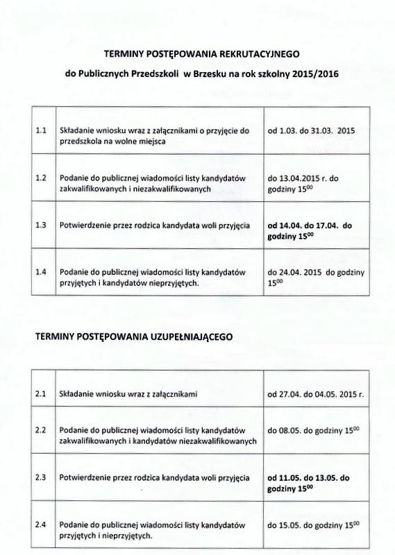 W załączeniu terminy postępowania rekrutacyjnego oraz Uchwała Nr V/26/2015 Rady Miejskiej w Brzesku.