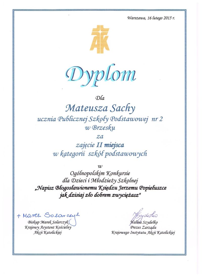 Najlepszą w szkole, następnie w diecezji tarnowskiej w kategorii szkół podstawowych była praca Mateusza Sachy, ucznia klasy 5c z Publicznej Szkoły Podstawowej nr 2 w Brzesku (opiekun Agata Podłęcka). Ta praca literacka znalazła też uznanie w finale w oczach jury w Warszawie. Mateusz otrzymał II miejsce na szczeblu ogólnopolskim.Uroczyste wręczenie nagród odbyło się w czasie ferii 16 lutego w Warszawie. Mateusz wziął udział w wielkiej gali z udziałem mediów i wielu znakomitości ze świata kultury i Kościoła, a następnie uczestniczył w nagraniu programu dla dzieci i młodzieży pt.”Ziarno” w TVP1. Miał możliwość być na planie „Pytania na śniadanie” oraz wystąpił w programie publicystycznym „Między ziemią a niebem”.