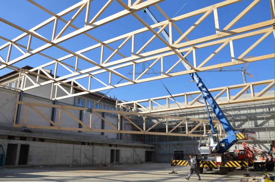 Prace rozpoczęły się wiosną ubiegłego roku i przebiegają zgodnie z przyjętym harmonogramem, od tamtego czasu teren został odwodniony, wykonano izolację fundamentów, położono beton pod posadzki, posadowione zostały słupy i dźwigary z drewna klejonego, wykonano ściany, schody wewnętrzne i płytę trybuny, niedawno zakończono prace związane z zadaszeniem sali.