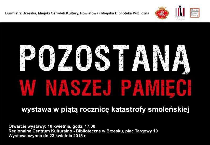 Burmistrz Brzeska Grzegorz Wawryka, Miejski Osrodek Kultury oraz Miejska i Powiatowa Biblioteka Publiczna zapraszają na wystawę, która otwarta zostanie 10 kwietnia, o godzinie 17.00 w Regionalnym Centrum Kulturalno-Bibliotecznym, w piątą rocznicę katastrofy smoleńskiej. Tytuł wystawy brzmi: "Pozostaną w naszej pamięci", czynna będzie do 23 kwietnia.