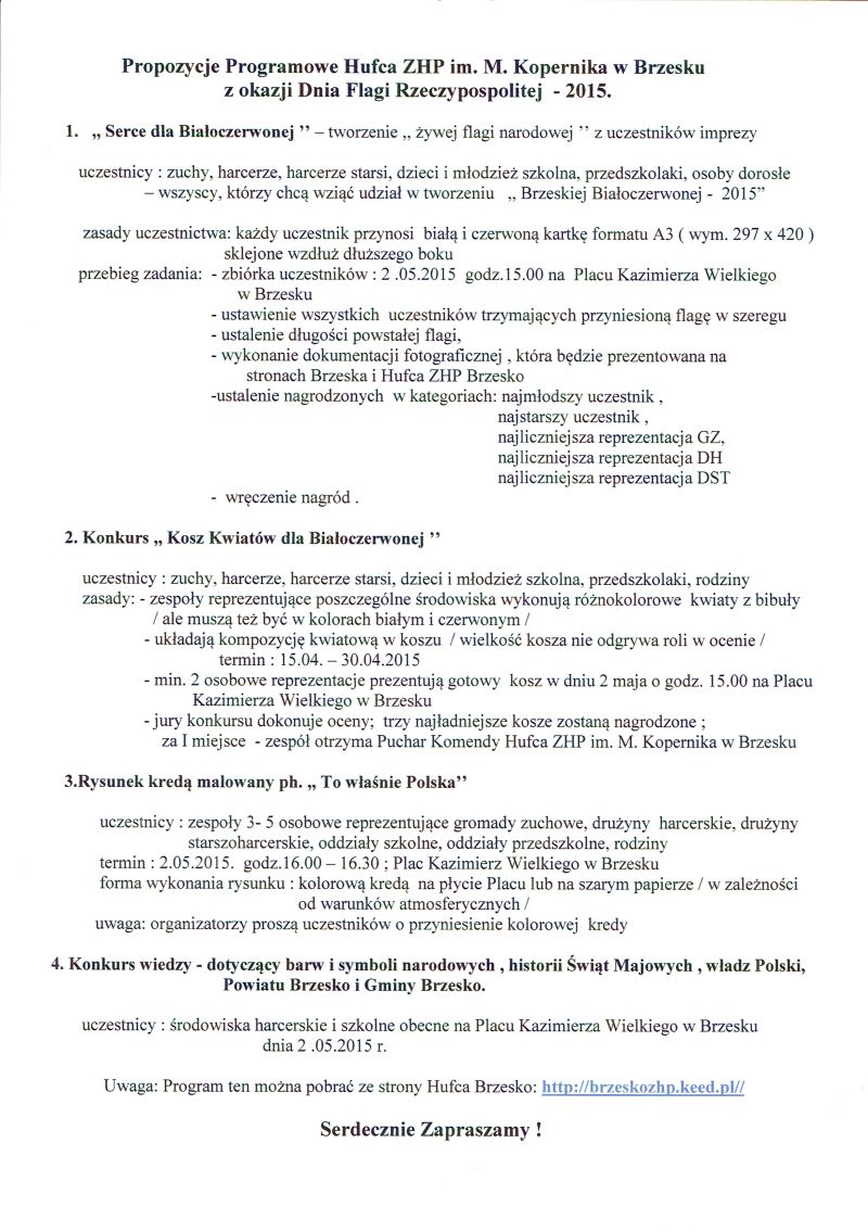 Hufiec ZHP im. Mikołaja Kopernika w Brzesku zaprasza do wspólnych obchodów Dnia Flagi Rzeczypospolitej - 2015. Dla uczestników spotkania, które odbędzie się 2 maja na Pl. Kazimierza Wielkiego przygotowano wiele zawodów i konkursów. Początek o godz. 15.00.W załączeniu przedstawiamy propozycje programowe.