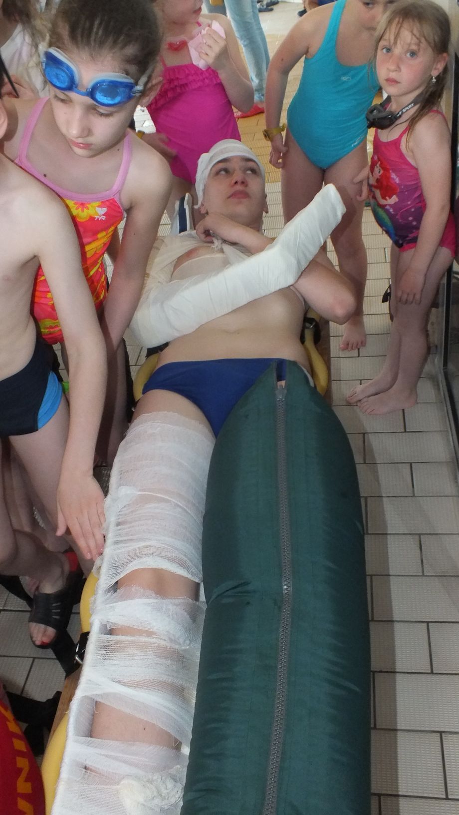 W przerwie zawodów odbył się krótki pokaz ratownictwa wodnego oraz pokaz prawidłowego bandażowania ran w wykonaniu ratowników WOPR, którzy strzegą bezpieczeństwa na brzeskiej pływalni.