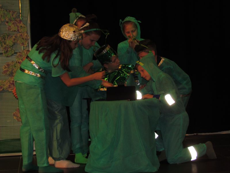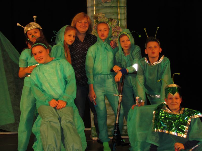 W rolę aktorów wcielili się uczniowie z klasy 5c: Patrycja Serafin, Klaudia Haber, Gabriela Gniadek, Kamila Kita, Bartłomiej Kózka, Piotr Owca, Mateusz Sacha.Zespół STONOGA został zaproszony do udziału w spotkaniu finałowym XXX Festiwalu Teatrów Dzieci i Młodzieży BAJDUREK w Nowym Sączu, który będzie miał miejsce 9-11 czerwca 2015r.„Ufolandia” to opowieść o fantastycznym świecie stworków, które są pełne ufności i tej samej ufności oczekują od odkrywanego przez nie świata. Same zaś żyją w przestrzeni wypełnionej dobrocią i przyjaźnią. Jak na to odpowie nowa, odkryta planeta? Spektakl jest refleksją nad kluczowymi potrzebami dzieci i poszukiwaniem wartości w coraz większym chaosie antywartości.Warto dodać, że w ciągu trzech dni konfrontacji przez scenę przewinęło się 500 młodych aktorów.