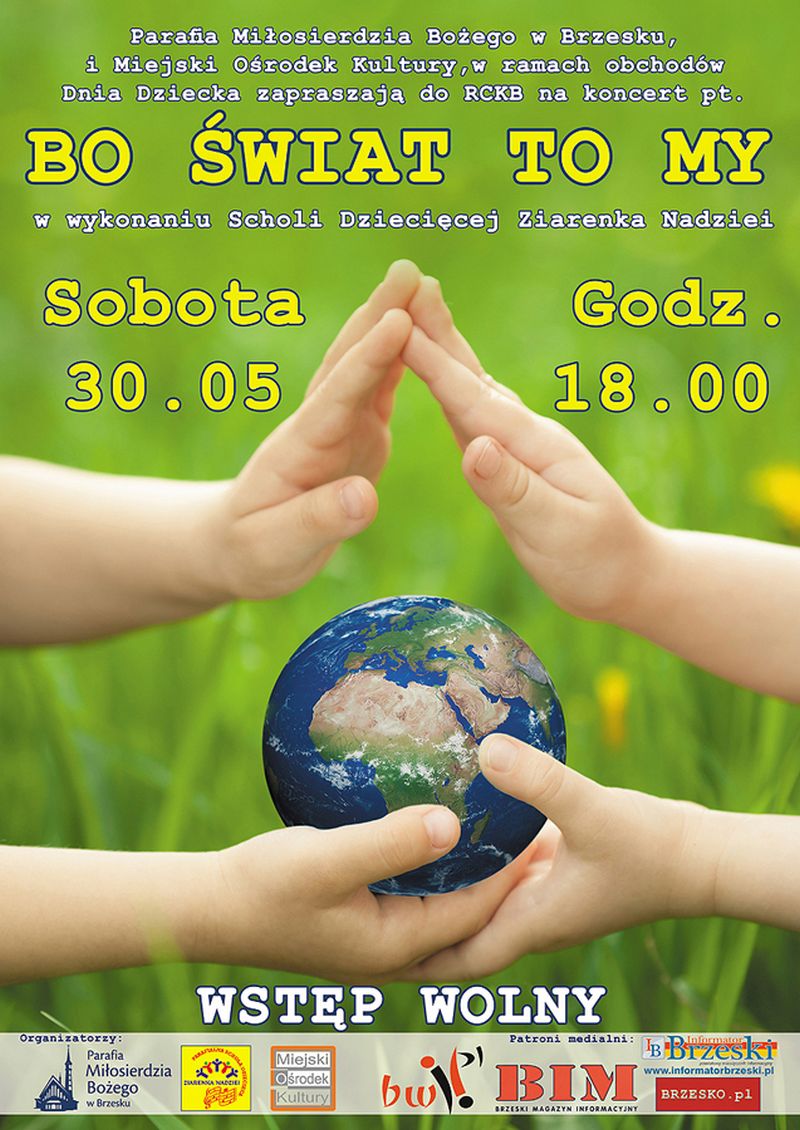 Schola Dziecięca Ziarenka Nadziei z parafii pw. Miłosierdzia Bożego w Brzesku serdecznie zaprasza całe Rodziny na wspólne świętowanie Dnia Dziecka.W sobotę 30 maja o godz. 18.00 w Regionalnym Centrum Kulturalno Bibliotecznym Ziarenka wystąpią ze specjalnie na tą okazję przygotowanym koncertem pt. "Bo Świat To My".Nie zabraknie dziecięcej radości, spontaniczności i dużej dawki energii. Nietuzinkowe elementy, z jakich składać będzie się to wydarzenie na pewno zainteresują wszystkie dzieci, zarówno te najmłodsze, jak i te urodzone nieco wcześniej. Zapraszamy do wspólnej zabawy. Do zobaczenia !Portal brzesko.pl patronuje temu wydarzeniu.