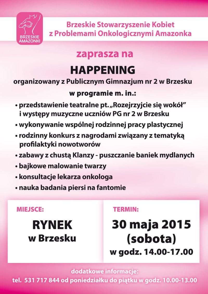 Brzeskie Stowarzyszenie Kobiet z Problemami Onkologicznymi wraz z Publicznym Gimnazjum Nr 2 w Brzesku zaprasza na happening związany z profilaktyką nowotworów u kobiet. Odbędzie się w dniu 30 maja (sobota) na brzeskim rynku w godzinach 13.00 do 16.00. Szczegóły na plakacie.