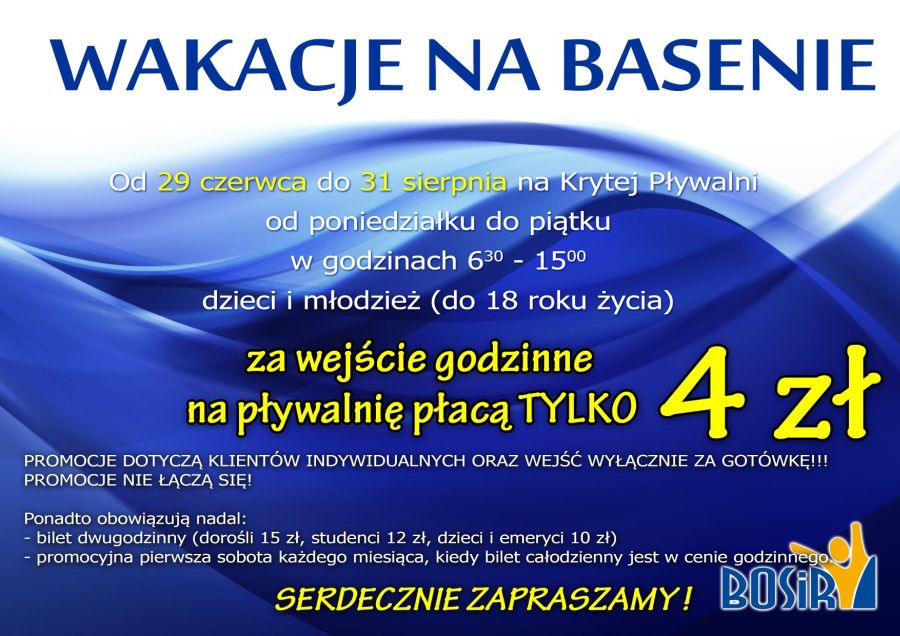 Kryta Pływalnia zaprasza dzieci i młodzież (do 18 roku życia), gdzie od 29 czerwca do 31 sierpnia 2015 roku wejście godzinne na pływalnię kosztuje TYLKO 4 ZŁ. Promocja obowiązuje w godzinach od 6.30 do 15.00 od poniedziałku do piątku.PROMOCJE DOTYCZĄ KLIENTÓW INDYWIDUALNYCH ORAZ WEJŚĆ WYŁĄCZNIE ZA GOTÓWKĘ!!! PROMOCJE NIE ŁĄCZĄ SIĘ!