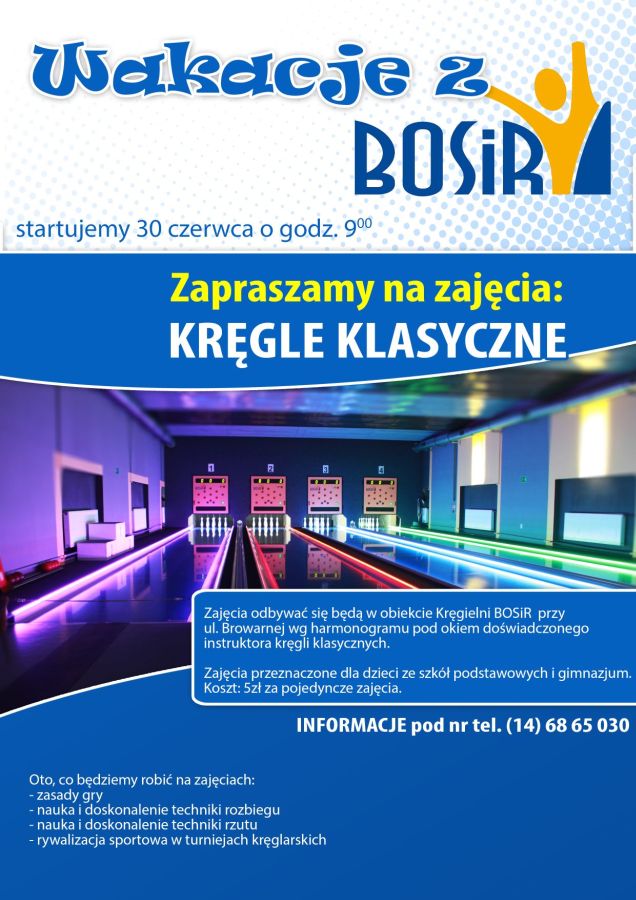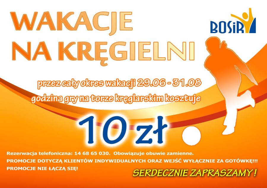Ponadto obowiązują nadal:- bilet dwugodzinny (dorośli 15 zł, studenci 12 zł, dzieci i emeryci 10 zł)- promocyjna pierwsza sobota każdego miesiąca, kiedy bilet całodzienny jest w cenie godzinnegoKręgielnia zaprasza dzieci i młodzież oraz całe rodziny. W okresie od 29 czerwca do 31 sierpnia 2015 roku obowiązywać będzie promocja cenowa. Godzina gry na torze kręglarskim kosztować będzie TYLKO 10 ZŁ.PROMOCJA DOTYCZY WEJŚĆ WYŁĄCZNIE ZA GOTÓWKĘ!!! PROMOCJE NIE ŁĄCZĄ SIĘ!Ponadto na Kręgielni BOSiR odbywać się będą dla dzieci i młodzieży (szkoła podst. i gimnazjum) zajęcia kręglarskie oraz tenisa stołowego. Koszt zajęć to 5 zł.Co będziemy robić na zajęciach:- tenis stołowy:1) Ćwiczenia oswajające z piłeczką oraz rakietką2) Poprawność chwytu rakietki stroną bekhendową oraz forhendową3) Nauka i doskonalenie uderzeń atakujących4) Nauka i doskonalenie uderzeń obronnych5) Nauka i doskonalenie uderzeń pośrednich (skróty, blok, Flip, piłka pusta)6) Nauka oraz doskonalenie zagrywki rotacyjnej, pustej, ciętej7) Nauka i doskonalenie odbioru serwisu oraz umiejętność odczytywania rotacji8) Rywalizacja sportowa (turnieje, zabawy ruchowe)- kręgle klasyczne:1) Zasady gry2) Nauka i doskonalenie techniki rozbiegu3) Nauka i doskonalenie techniki rzutu4) Rywalizacja sportowa w turniejach kręglarskich