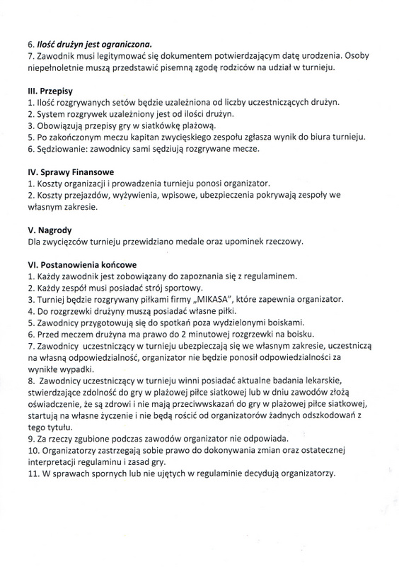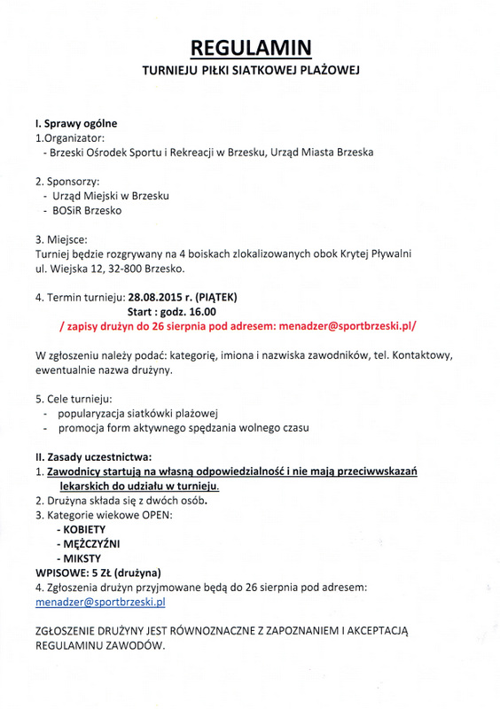 Brzeski Ośrodek Sportu i Rekreacji serdecznie zaprasza miłośników siatkówki plażowej na turniej kończący tegoroczne wakacje.Zawody odbędą się 28 sierpnia 2015 roku na boiskach do siatkówki plażowej obok Krytej Pływalni w Brzesku.Startujemy o godz. 16.00Zapisy drużyn do 26 sierpnia pod adresem: menadzer@sportbrzeski.plIlość drużyn ograniczona!Kategorie wiekowe OPEN:- kobiety- mężczyźni- miksty