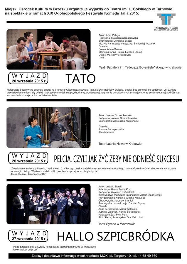 Miejski Ośrodek Kultury zaprasza na wyjazd do teatru w Tarnowie na spektakle odbywające się w ramach festiwalu Talia. Szczegóły na plakacie