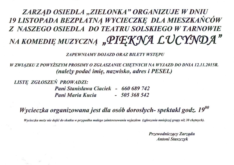 Zarząd Osiedla „Zielonka” organizuje w dniu 19 listopada bezpłatną wycieczkę dla mieszkańców do teatru Solskiego w Tarnowie na komedię muzyczną „Piękna Lucynada”.Wszystkich chętnych prosimy o zgłaszanie się na wyjazd do dnia 12 listopada.Wycieczka jest organizowana dla osób dorosłych – spektakl o godz. 19.00. Więcej informacji w załączniku. W ramach programu profilaktyczno edukacyjnego i wychowawczego w dniu 3 października odbędzie się wycieczka dla dzieci z Osiedla „Zielonka” do tężni solankowej w Wieliczce oraz do ogrodu zoologicznego ZOO w Krakowie. Uczestnicy maja zapewniony dojazd, bilety wstępu, oraz drobny poczęstunek.Zapisy do dnia 28 września.Przewodniczący Zarządu Antoni Staszczyk
