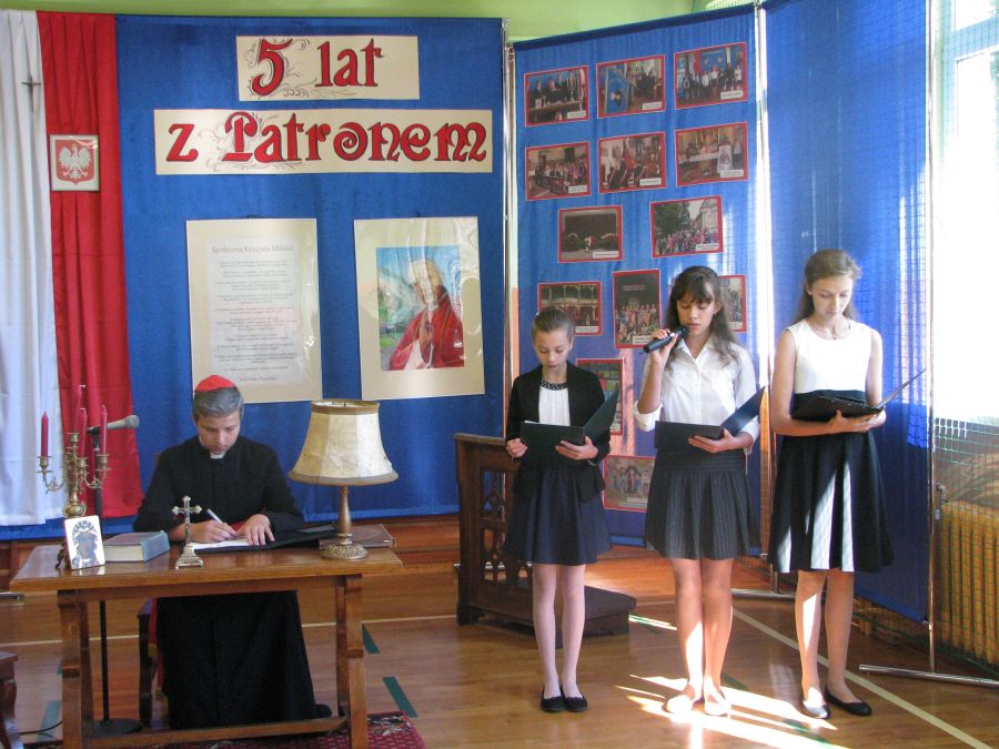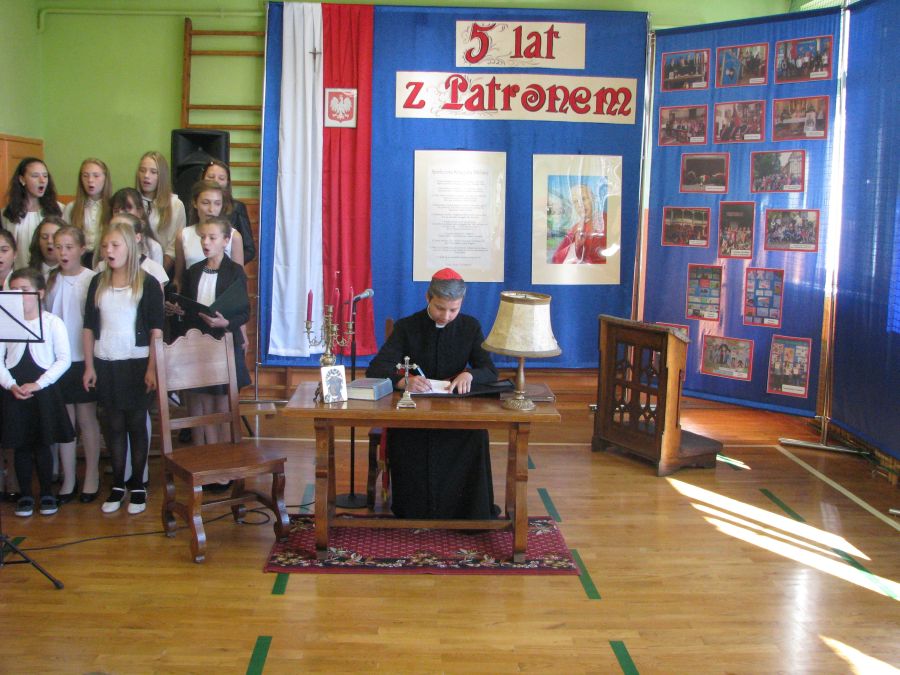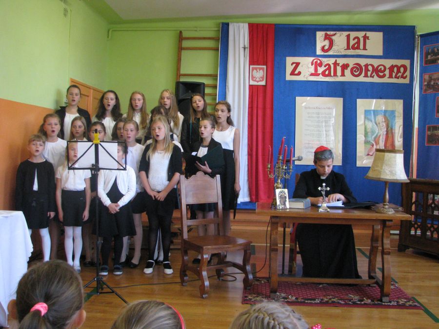 Po krótkim powitalnym przemówieniu dyrektor Jolanty Latochy rozpoczęła się część artystyczna, którą przygotowały Iwona Grochola oraz Elżbieta Szydłowska. Nie była to jednak zwykła szkolna akademia, lecz nastrojowa inscenizacja, opowiadająca o życiu i dokonaniach kardynała Stefana Wyszyńskiego. Dzięki recytatorom i słowom samego kardynała - w jego postać wcielił się uczeń klasy VI Wiktor Korbaś- uczestnicy uroczystości stali się przez godzinę towarzyszami drogi życiowej Prymasa Tysiąclecia. (Elżbieta Szydłowska)
