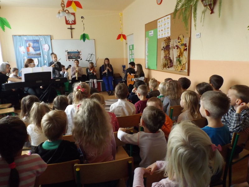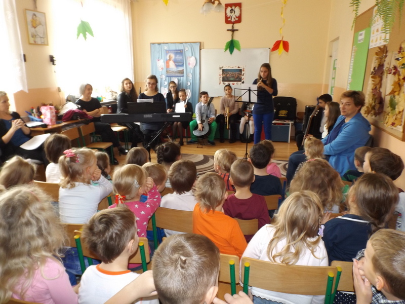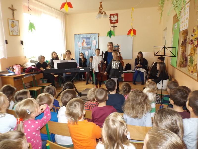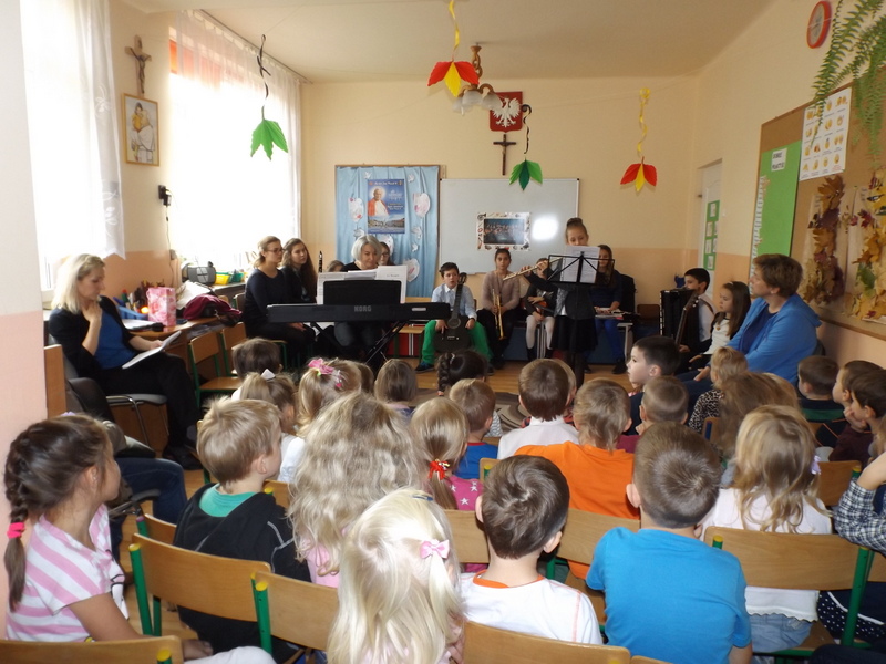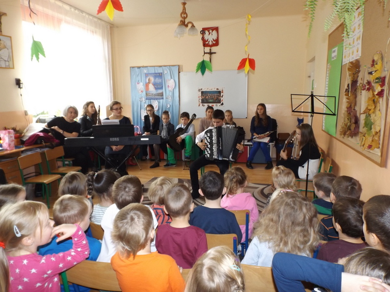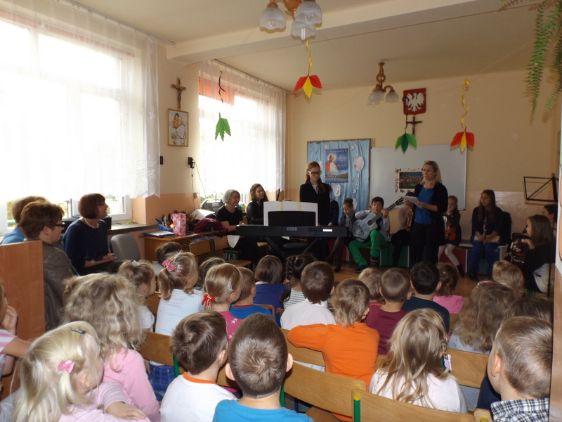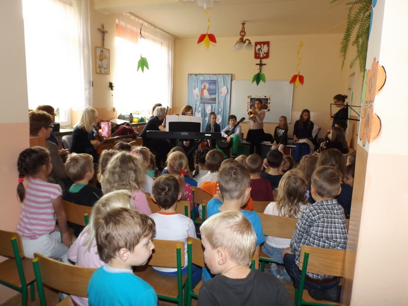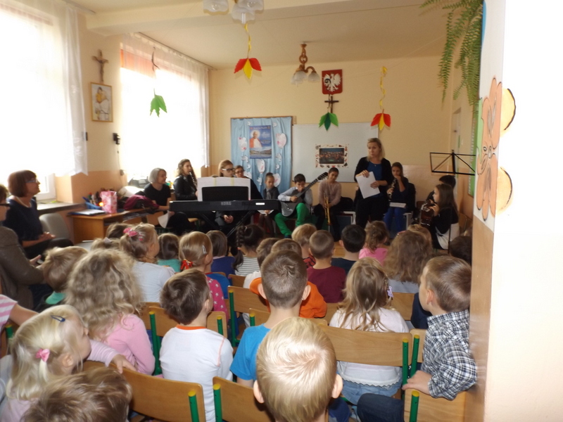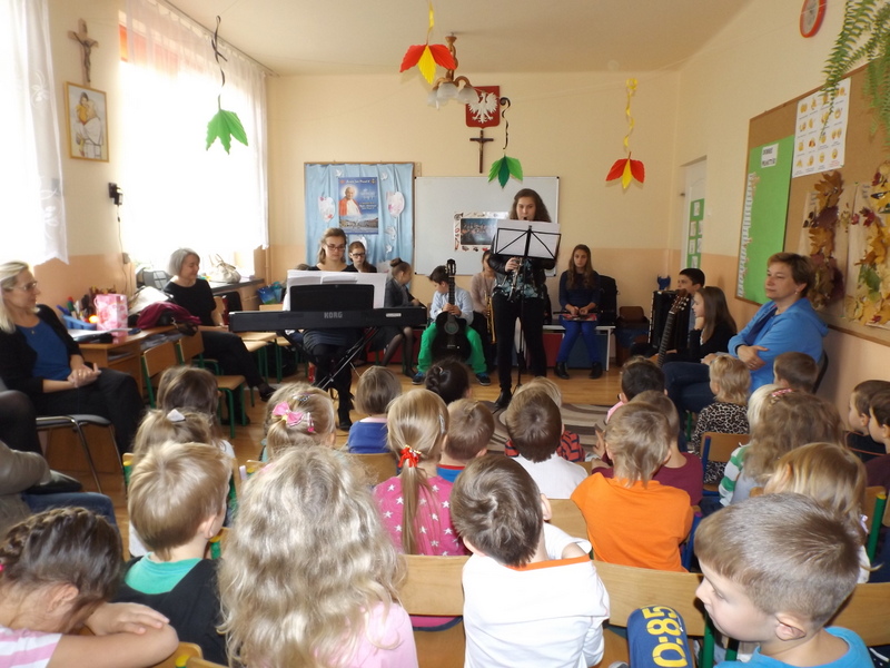 29-10-2015 r. Publiczne Przedszkole w Szczepanowie odwiedzili młodzi artyści Publicznej Szkoły Podstawowej I Stopnia w Brzesku, a to za sprawą Pani Dyrektor Ilony Latochy- Dylewskiej, która zechciała przyjąć zaproszenie przedszkolaków. Wirtuozi wraz ze swoimi Mistrzami zaprezentowali swój repertuar najmłodszej publiczności. Na deskach naszego przedszkola wystąpili:Amelia Lechowicz Amelia Lechowicz - pianino z utworem Nokturn J. Field, Amelia Sowa- gitara z utworem Walc M. Carcassi, Beata Stalmach – skrzypce z utworem Piosenka Shanghaj Ros Stephen, Katarzyna Hermaszewska - wiolonczela z utworem On the go K.D. Blackwell, Konrad Krzywda – akordeon, Zuzanna Cylka - flet z utworem Le basove Marin Marais, Maria Wszołek - obój z utworem Marsz V. Kalinnikov, Franek Bochenek - gitara z utworem Mały blues Mirosław Drożdżowski, Anna Śmietana - trąbka z utworem Reigen T. Susato, Magdalena Malinowska - klarnet z utworem Nokturn P. Czajkowski.Obowiązki konferansjera przejęła Pani Dyrektor Ilona Latocha-Dylewska, która jednocześnie prezentowała poszczególne instrumenty, oraz wyjaśniała sposób wydobywania z nich dźwięku. Mali słuchacze też mogli pochwalić się swoja znajomością instrumentów muzycznych. Dla wszystkich odbiorców muzyki były niezapomniane chwile obcowania ze sztuką przez duże C, o czym świadczy fotokronika.Foto/tekst - PP Szczepanów