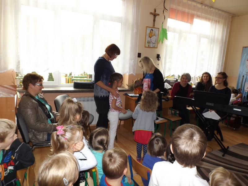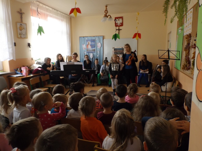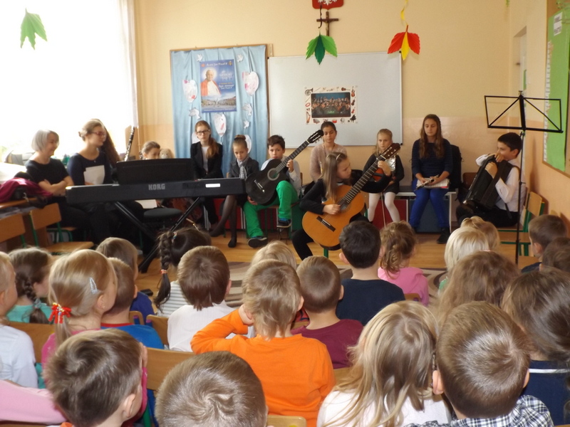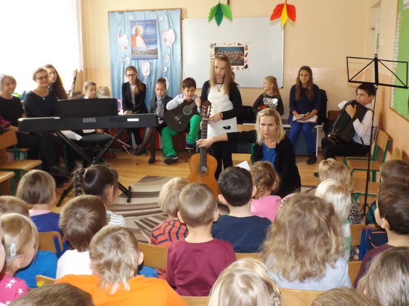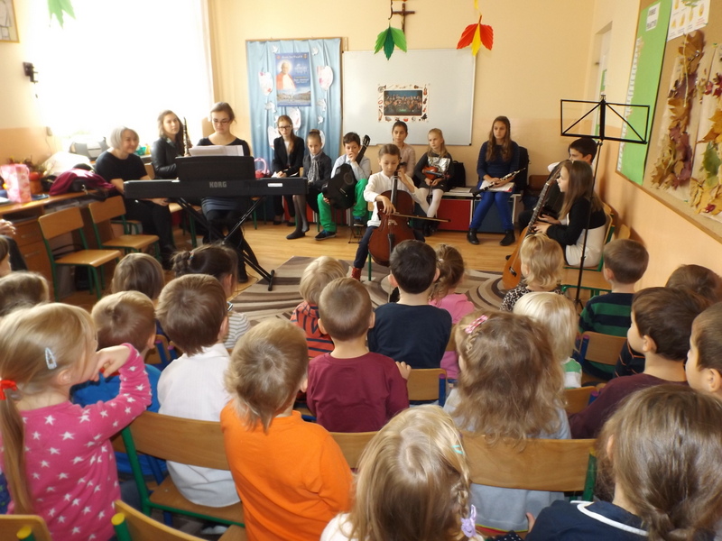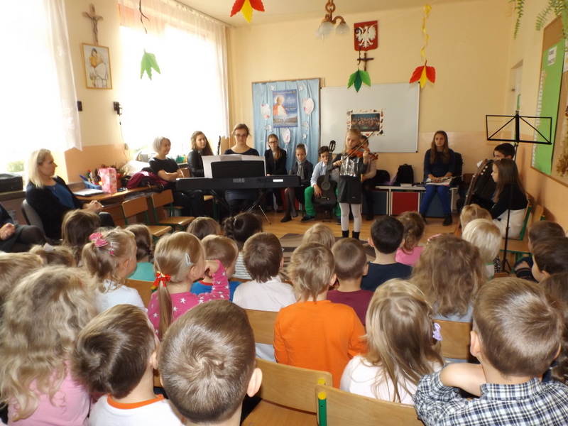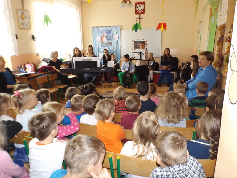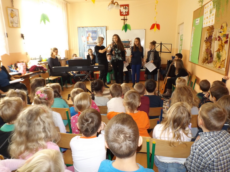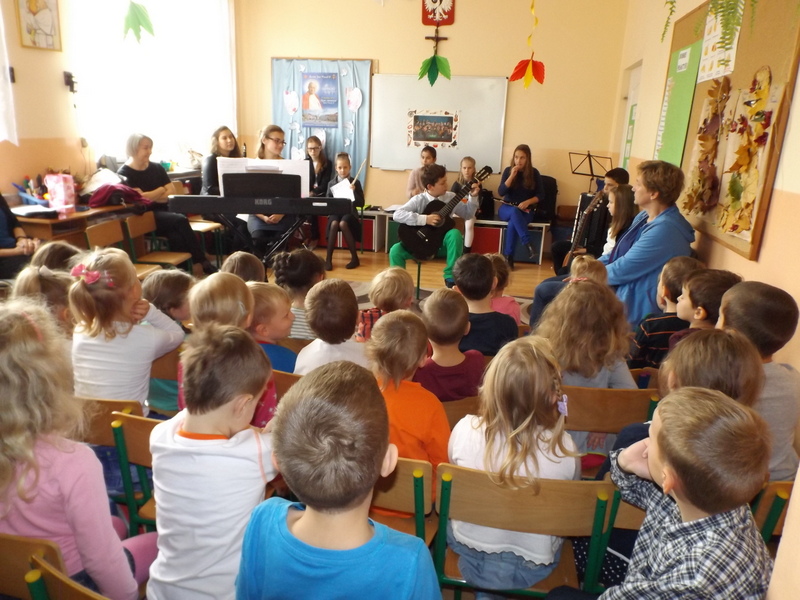 29-10-2015 r. Publiczne Przedszkole w Szczepanowie odwiedzili młodzi artyści Publicznej Szkoły Podstawowej I Stopnia w Brzesku, a to za sprawą Pani Dyrektor Ilony Latochy- Dylewskiej, która zechciała przyjąć zaproszenie przedszkolaków. Wirtuozi wraz ze swoimi Mistrzami zaprezentowali swój repertuar najmłodszej publiczności. Na deskach naszego przedszkola wystąpili:Amelia Lechowicz Amelia Lechowicz - pianino z utworem Nokturn J. Field, Amelia Sowa- gitara z utworem Walc M. Carcassi, Beata Stalmach – skrzypce z utworem Piosenka Shanghaj Ros Stephen, Katarzyna Hermaszewska - wiolonczela z utworem On the go K.D. Blackwell, Konrad Krzywda – akordeon, Zuzanna Cylka - flet z utworem Le basove Marin Marais, Maria Wszołek - obój z utworem Marsz V. Kalinnikov, Franek Bochenek - gitara z utworem Mały blues Mirosław Drożdżowski, Anna Śmietana - trąbka z utworem Reigen T. Susato, Magdalena Malinowska - klarnet z utworem Nokturn P. Czajkowski.Obowiązki konferansjera przejęła Pani Dyrektor Ilona Latocha-Dylewska, która jednocześnie prezentowała poszczególne instrumenty, oraz wyjaśniała sposób wydobywania z nich dźwięku. Mali słuchacze też mogli pochwalić się swoja znajomością instrumentów muzycznych. Dla wszystkich odbiorców muzyki były niezapomniane chwile obcowania ze sztuką przez duże C, o czym świadczy fotokronika.Foto/tekst - PP Szczepanów