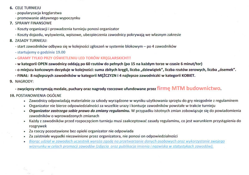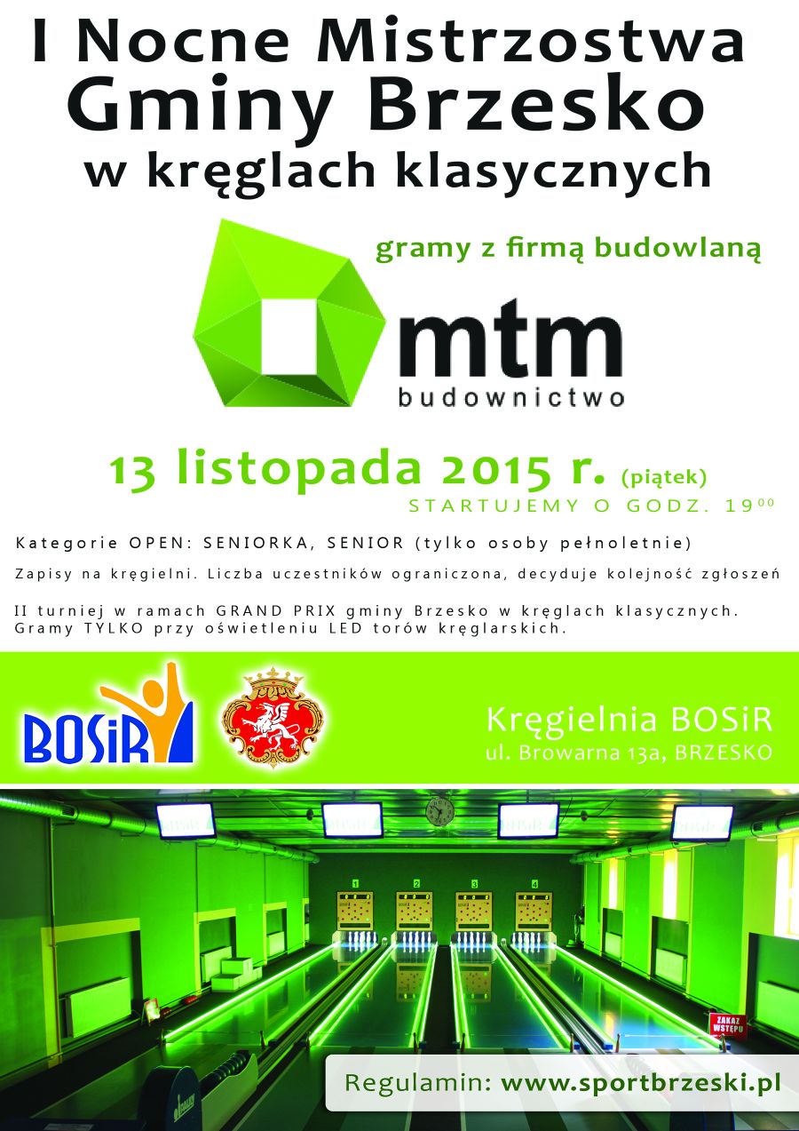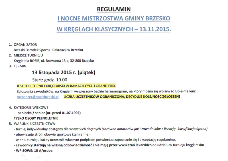 Brzeski Ośrodek Sportu i Rekreacji zaprasza miłośników kręgli klasycznych do udziału w I Nocnych Mistrzostwach Gminy Brzesko. Będzie to II turniej w ramach Grand Prix Gminy Brzesko. Zawody odbędą się 13 listopada 2015 (piątek). Starujemy o godz. 19.00.Kategorie wiekowe: SENIORKA, SENIOR (tylko osoby pełnoletnie).Jest to II turniej w ramach cyklu GRAND PRIX.Zgłoszenia przyjmowane są na kręgielni, wywieszony będzie harmonogram, na który należy się wpisać, lub kontakt pod adresem menadzer@sportbrzeski.pl.LICZBA UCZESTNIKÓW OGRANICZONA, DECYDUJE KOLEJNOŚĆ ZGŁOSZEŃ.