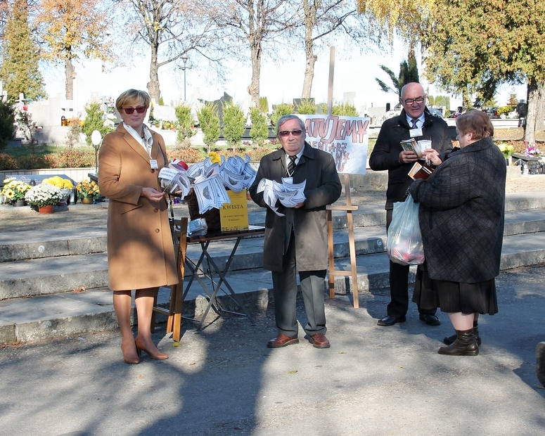 W czasie tegorocznej kwesty organizowanej na Cmentarzu Parafialnym w dniach 31.X. i 1. XI zebrana kwota wyniosła 4054,50 zł. Kwesta na Cmentarzu Komunalnym przyniosła 5172,34 zł. W kwestach na obydwu cmentarzach brali udział harcerze - uczniowie PSP nr 2, wolontariusze ZSP nr1, młodzież Katolickiego Gimnazjum i Liceum, członkowie UTW, członkowie Komitetu, samorządowcy, mieszkańcy, ludzie troski o nasze dziedzictwo kulturowe. Pragnę dodać, że w czasie naszej 19-letniej kwesty biorą udział wolontariusze, od lat są z nami Maria Nawrocka, Kazimierz Pieprzyk, Janusz Przybylski, Stanisław Gębski, Anna Obłąk, Kazimierz Wawrykiewicz, Tomasz Filip, Krzysztof Bigaj, Grażyna Stós, Agnieszka Stós-Stawarz, Andrzej Małysa, Romualda Szot, Jan Puchalski, Maria Babicz, Bogusław Babicz, Jan Opiła, Jan Dumański, Krzysztof Ożegalski. Wielu już od nas odeszło - Michał Habryło, Andrzej Habryło, Stanisław Ciszkowicz.