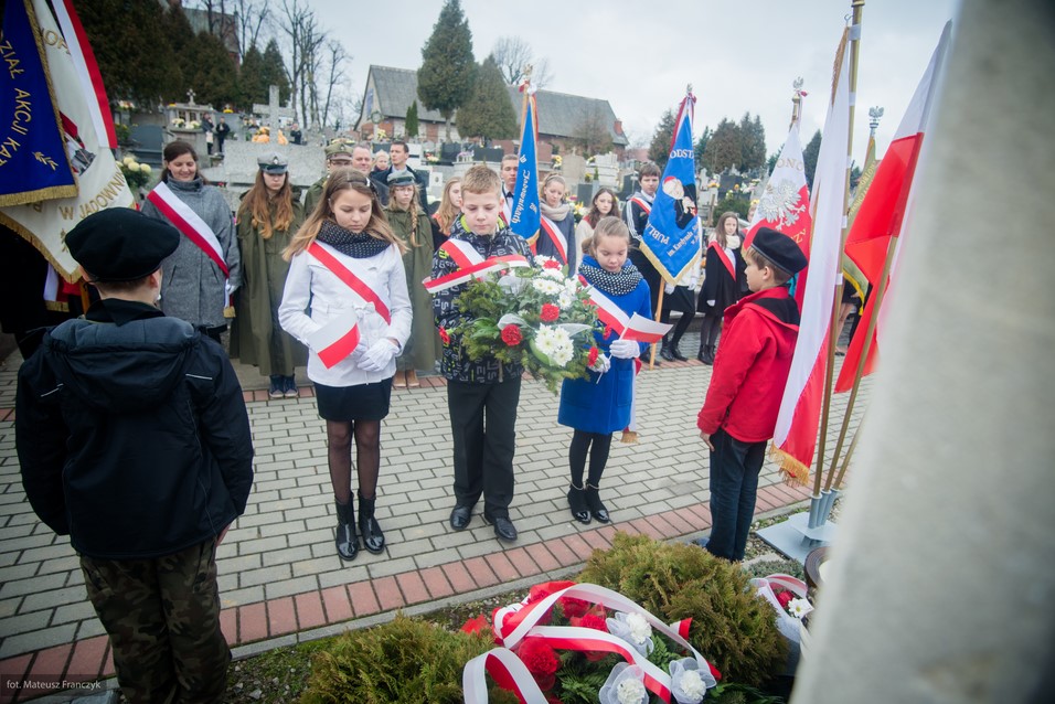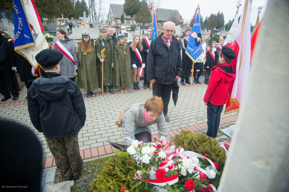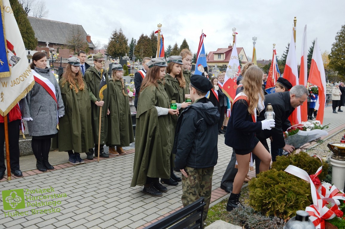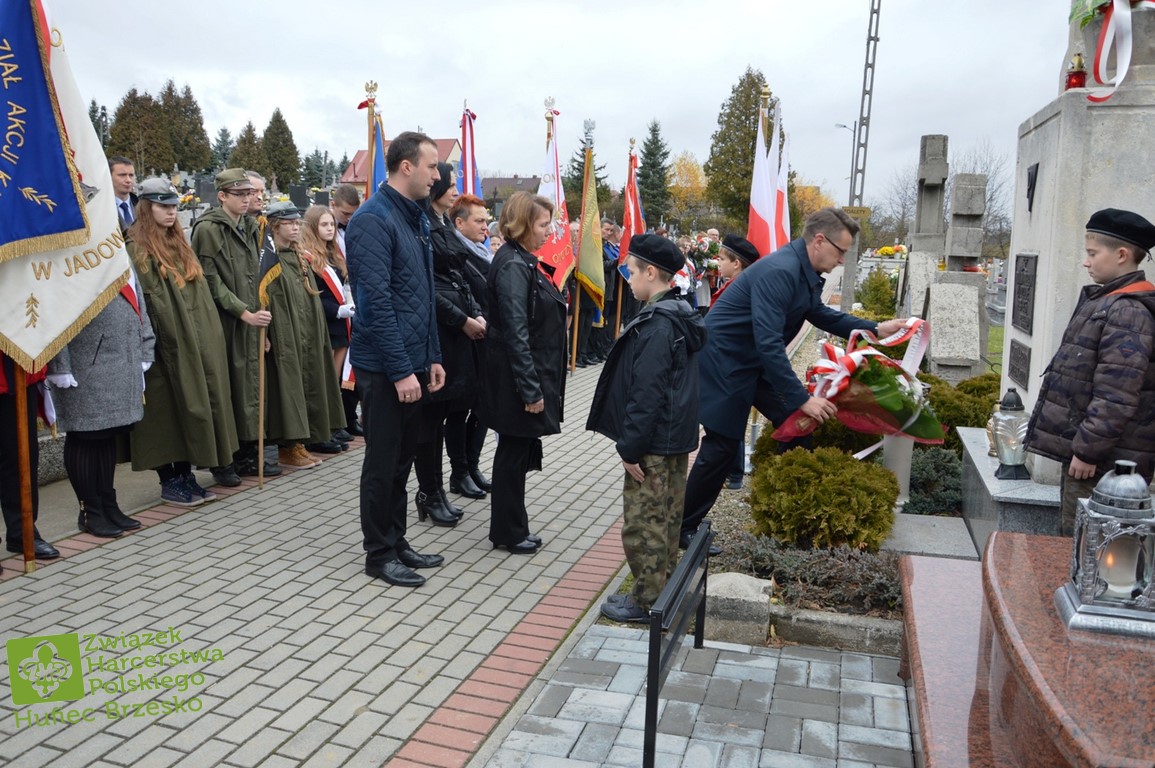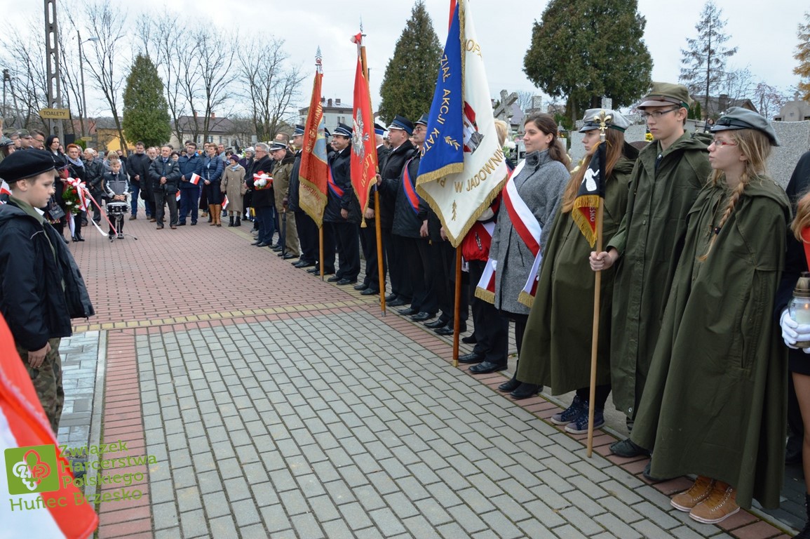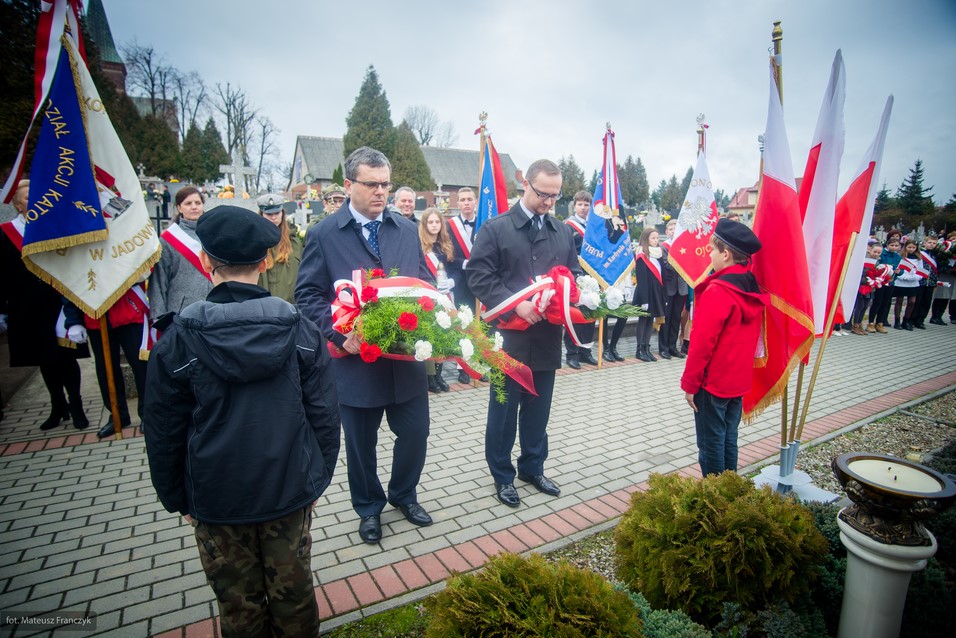 Po odśpiewaniu hymnu i odczytaniu apelu poległych pod pomnikiem delegacje złożyły kwiaty i zapaliły znicze. Kwiaty w imieniu mieszkańców Jadownik złożył sołtys Jarosław Sorys wraz z małżonką w towarzystwie członków Rady Sołeckiej. Następnie kwiaty składali radni Adam Smołucha i Maciej Podobiński, delegacja gimnazjum z dyrektorem Tomaszem Wietechą i harcerzami, delegacje szkół podstawowych nr1 i nr2, przedstawiciele Towarzystwa Miłośników Ziemi Jadownickiej.