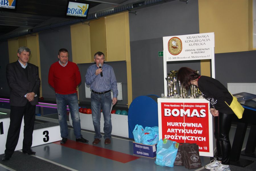 15 listopada na kręgielni Brzeskiego Ośrodka Sportu i Rekreacji w Brzesku odbył się XV jubileuszowy Turniej Kręglarski Kupców o Puchar Prezesa Krakowskiej Kongregacji Kupieckiej. Przed rozpoczęciem zawodów minutą ciszy uczczono ofiary tragicznych zamachów we Francji, oraz zmarłego syna Jerzego Kotali, Zastępcy Prezesa KKK. Honorowy patronat sprawował Burmistrz Brzeska Grzegorz Wawryka. W zawodach uczestniczyli przedstawiciele kupców z Krakowa, Limanowej, Proszowic, Przemyśla i gospodarz z Brzeska. Jednak najliczniejsza grupa przyjechała z Limanowej. W turnieju uczestniczyły całe rodziny, była to impreza typowo rodzinna, a najmłodszy z uczestników miał niespełna 3 latka. Frekwencja jak zawsze dopisała, w zawodach startowało ponad 100 uczestników. Turniej rozgrywano w kategoriach; dzieci, kobiety i mężczyźni. Fundatorem pucharów w wymienionych kategoriach był Burmistrz Brzeska Grzegorz Wawryka. W kategorii drużynowej fundatorem pucharów był Prezes Krakowskiej Kongregacji Kupieckiej Wiesława Jopek. Walka na torach była bardzo zacięta, a o zwycięstwie i kolejności na podium decydował nieraz jeden punkt.Oto zwycięzcy:W kategorii dzieci najlepszy wynik uzyskał Patryk Kicka, drugą lokatę zajęła Anna Babraj, trzecie miejsce Jakub Kuryło, całe podium należało do reprezentantów Brzeska.W kategorii kobiet I miejsce wywalczyła Iwona Sumara, Katarzyna Pacewicz - Pyrek zdobyła II miejsce, obie panie z Brzeska, a najniższe miejsce na podium zajęła Krystyna Śmierciak z Limanowej.Wśród mężczyzn zwyciężył Bartosz Pośladek z Brzeska, II miejsce zajął Tomasz Śmierciak, a na III miejscu uplasował się Mirosław Zoń, obaj panowie z Limanowej.W rywalizacji drużynowej I miejsce wywalczyli zawodnicy z Brzeska, II miejsce po zaciętej walce zdobył oddział z Limanowej, na III stopniu podium uplasował się Kraków. Poza podium uplasowały się oddziały z Proszowic, Myślenic i Przemyśla.Najlepszy wynik zawodów uzyskał Bartosz Pośladek - 120 punktów. Najmłodszym uczestnikiem zawodów była 3 letnia Antonina Wojtas z Limanowej.Brzeski oddział Krakowskiej Kongregacji Kupieckiej dziękuję sponsorom za pomoc w przeprowadzeniu turnieju, a byli nimi;Urzad Miejski w Brzesku, Restauracja „Klimaty” Bogdana Kądziołki, Kwiaciarnia „Bazar” Katarzyny Pacewicz – Pyrek, oraz Mini Market „Pod Dębem” Bogdana Baranka.Organizatorzy pragną podziękować za pomoc w organizacji turnieju; ANNIE i ADRIANOWI NOWAK oraz BORYSOWI PACEWICZ-PYREK.Bogdan Baranek