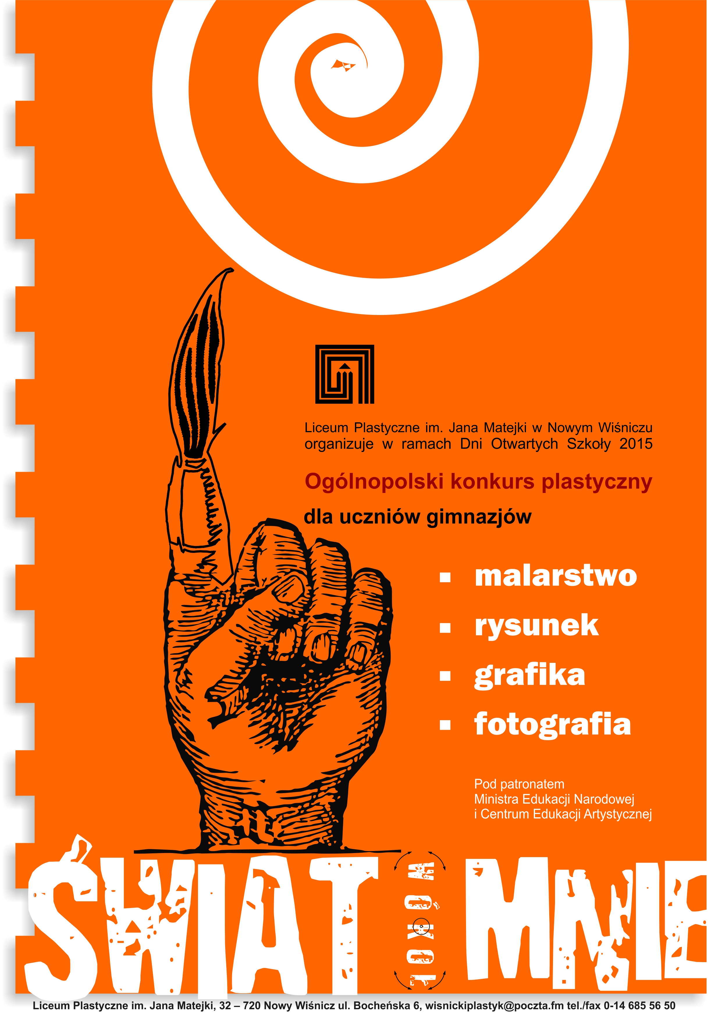 Od wielu lat Liceum Plastyczne im. Jana Matejki w Nowym Wiśniczu organizuje seminaria dla nauczycieli plastyki szkół podstawowych oraz gimnazjów. W wyniku wspólnych spotkań zrodziła się myśl zorganizowania konkursu plastycznego dla uczniów. Przez kilka lat konkurs skierowany był do uczniów gimnazjów województwa małopolskiego. Ponieważ cieszył się ogromnym zainteresowaniem, a do szkoły docierały prośby o rozszerzenie zasięgu, postanowiliśmy przekształcić go na ogólnopolski. Konkurs „Świat wokół mnie” obok pobudzania aktywności plastycznej młodzieży stwarza również możliwość integracji uczniów kreatywnych i uzdolnionych plastycznie. Uczniowie mają możliwość prezentacji wykonanych własnoręcznie prac plastycznych we wskazanych technikach: malarstwo, rysunek, grafika, fotografia. Prace oceni komisja złożona z artystów plastyków zatrudnionych w szkole. Ogłoszenie wyników i wręczenie nagród odbędzie się 22 marca 2016 r. w Dniu Otwartym Liceum Plastycznego im. Jana Matejki w Nowym Wiśniczu na wernisażu wystawy pokonkursowej. Wystawie towarzyszył będzie katalog. Dla uczniów gimnazjów udział w konkursie będzie pewnym wyzwaniem.
