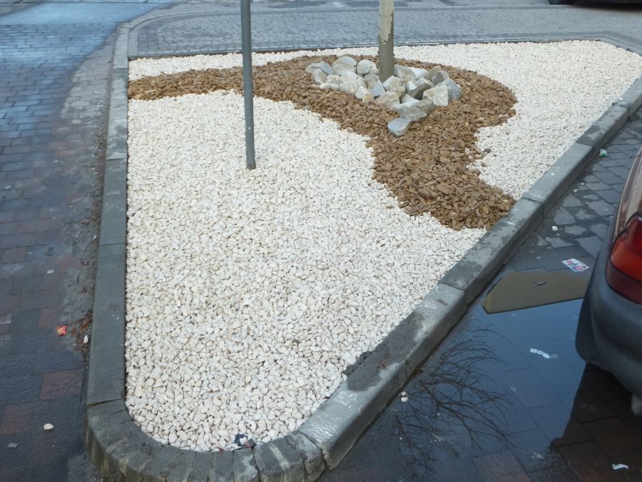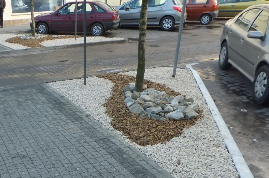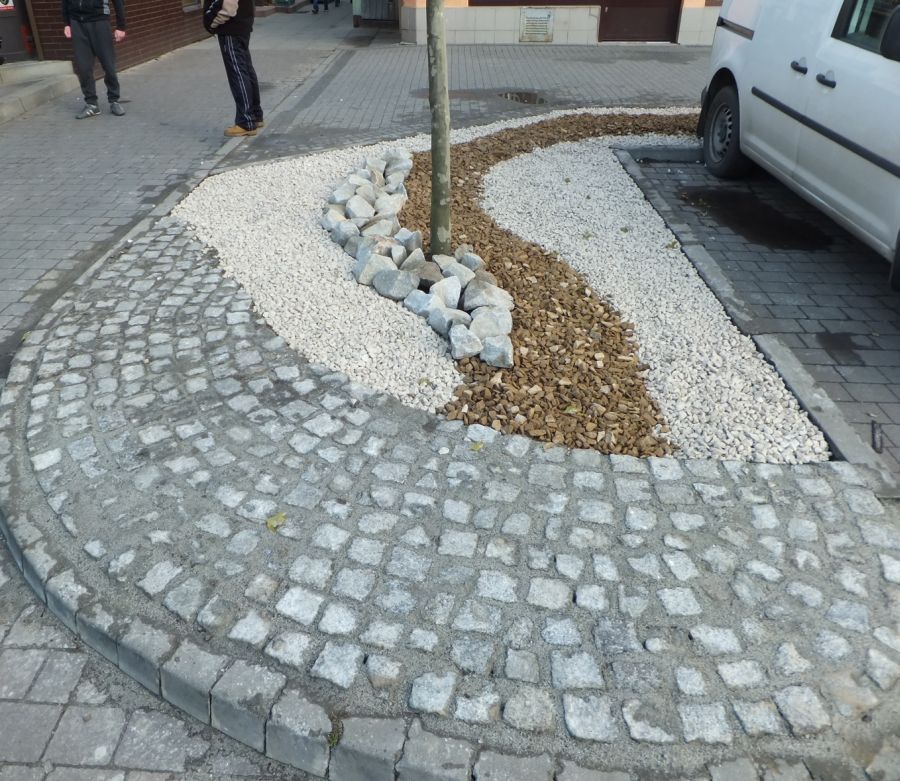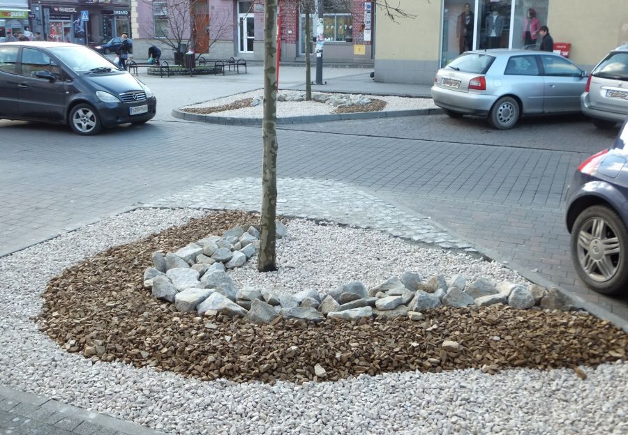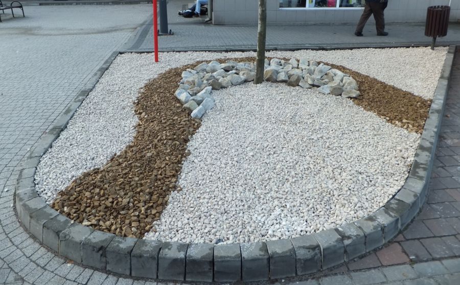 Po raz kolejny władze i pracownicy Urzędu Miejskiego w Brzesku udowodnili, że zależy im na estetycznym wyglądzie miasta, dlatego też podjęto decyzję o kosmetyce Placu Żwirki i Wigury, na którym to obsadzone niskimi krzewami i trawami ozdobnymi zieleńce były notorycznie zadeptywane czy zajeżdżane przez pojazdy. Niejednokrotne próby przywrócenia zielonej części nie dały jednak pożądanych efektów. W pierwszej kolejności podjęto działania mające na celu likwidację kolein w zieleńcach poprzez wyłożenie kostką granitową narożników najbardziej narażonych na zajeżdżanie, która to jest odpornym i odpowiednim materiałem do zastanego w terenie.W następnym etapie dokonano ozdobienia Placu poprzez wykonanie kamiennej kompozycji z kruszywa różnej frakcji i kolorystyki według koncepcji projektowej, którą wykonała Aleksandra Nalepa, architekt krajobrazu, pracownik Referatu Gospodarki Komunalnej i Ochrony Środowiska Urzędu Miejskiego w Brzesku. Realizacją założenia projektowego zajęły się Brzeskie Zakłady Komunalne pod nadzorem pomysłodawczyni. Do wyłożenia Placu wykorzystano kamień wapienny w odcieniach bieli, który stanowi tło dla kamiennej kompozycji. Widoczny rysunek na białej podstawie kreśli kwarcyt w barwach jesiennych wpisany kolorystycznie do zastanej brązowo-pomarańczowej tonacji nawierzchni parkingów. Aby podkreślić widoczne faliste linie wzmocniono efekt poprzez dodanie dużych kamieni granitowych. Kompozycja zyskała trójwymiarowości, aby nie stworzyć płaskiego terenu wyłożonego kamieniem.Łamany granit został umieszczony głownie przy rosnących tam platanach klonolistnych podkreślając ich ciekawą, łuszczącą się płatami korę.Wszystkie te czynności niewątpliwie przyczyniły się nie tylko do poprawy estetycznego wyglądu i wzrostu atrakcyjności Placu Żwirki i Wigury, który był nieumyślnie dewastowany, ale także ułatwiły komunikację i swobodne poruszanie się w otoczeniu, które nie straszy już błotem i marną roślinnością.