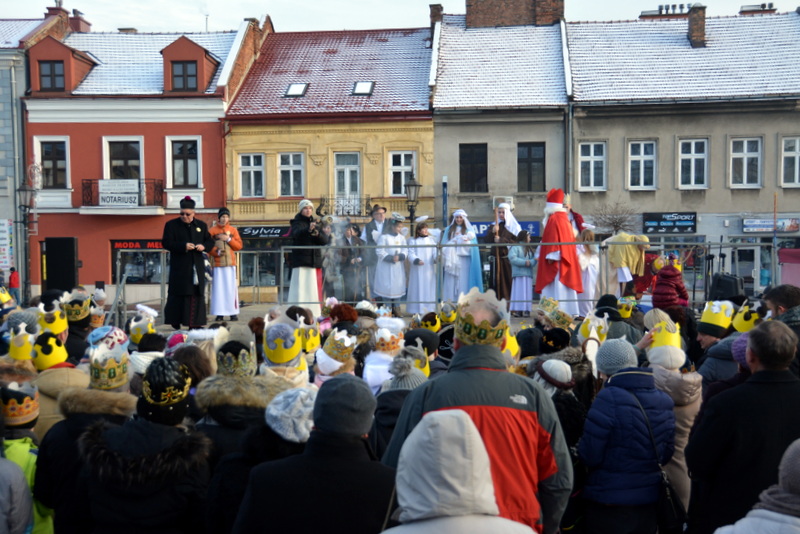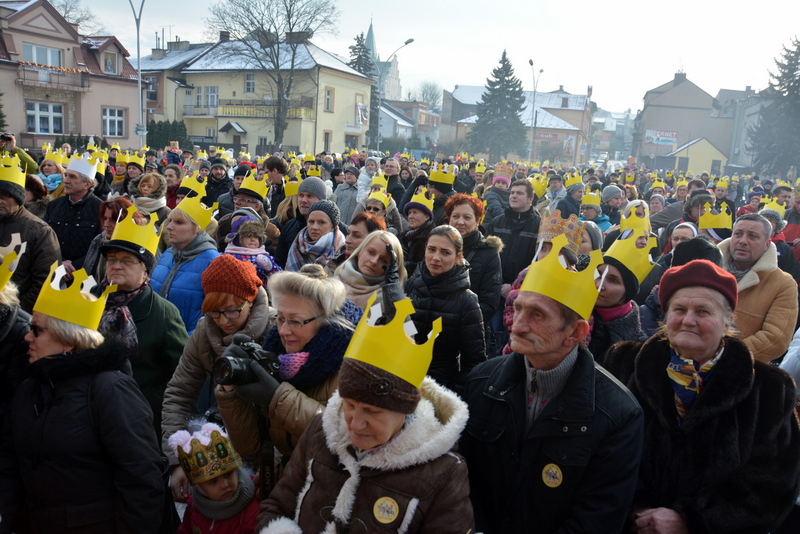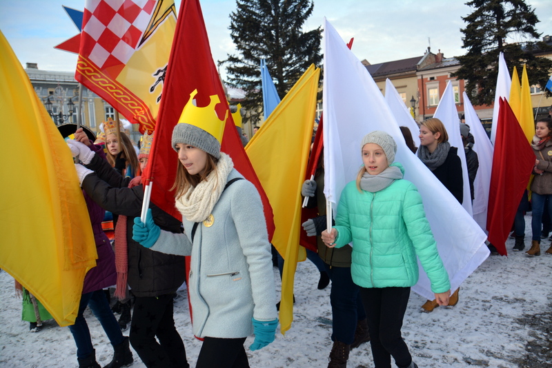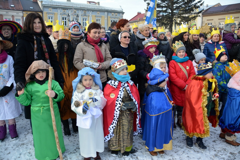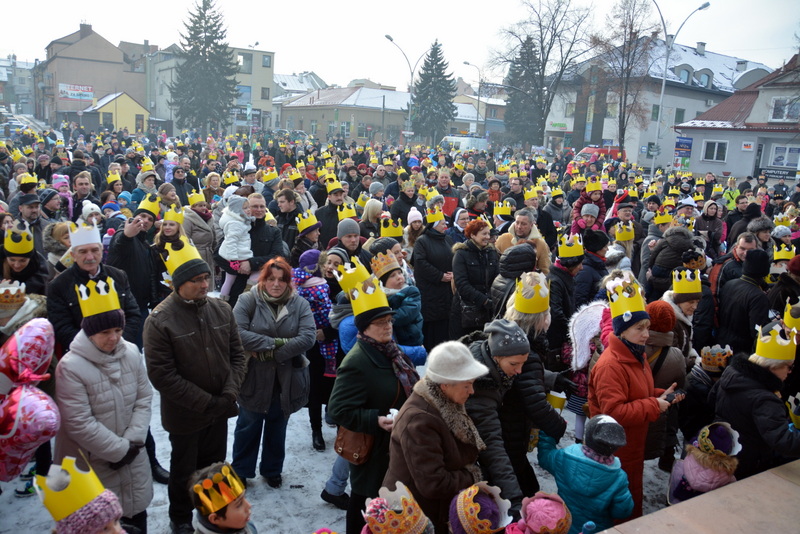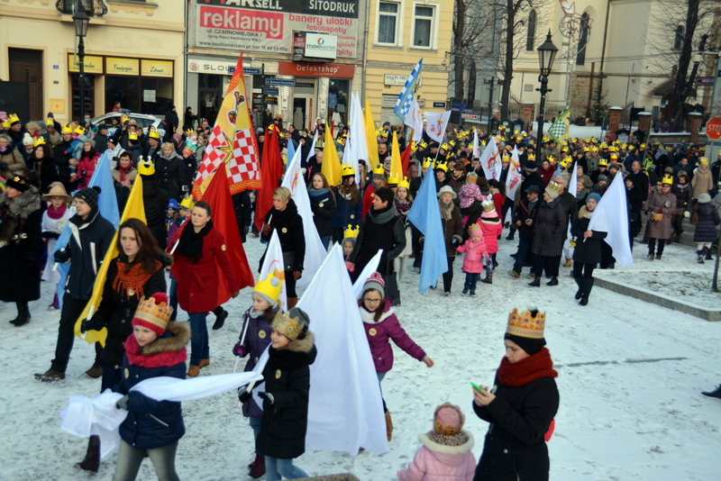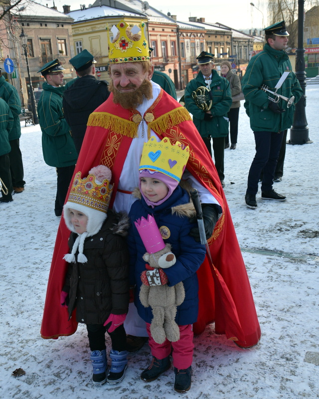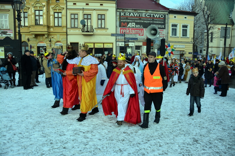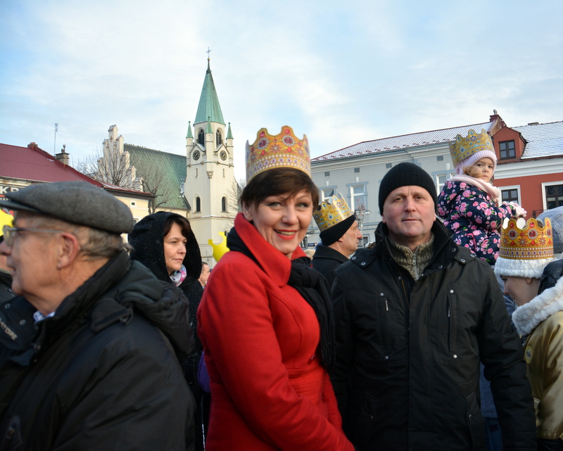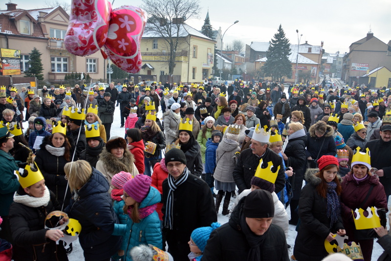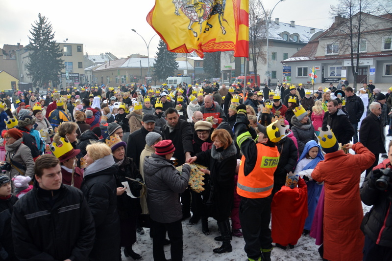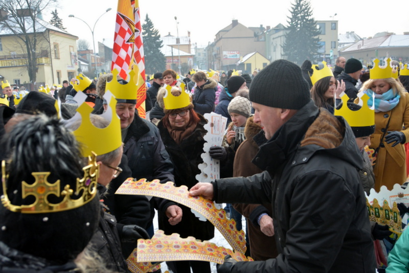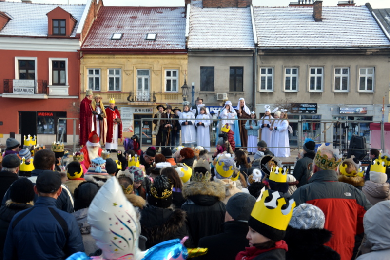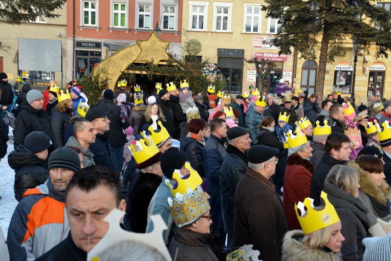 Piękna, słoneczna pogoda powitała w ubiegłą środę uczestników czwartego już Orszaku Trzech Króli w Brzesku.Blisko dwa tysiące ludzi - dzieci i dorosłych, niejednokrotnie w strojach i z koronami na głowach, z gwiazdami i flagami przemaszerowało ulicami Brzeska, śpiewając wspólnie kolędy.Na placu Kazimierza Wielkiego wszystkich przybyłych powitał wiceburmistrz Jerzy Tyrkiel oraz proboszczowie brzeskich parafii - Józef Drabik i Wojciech Werner. Przybyłym rozdano korony, których w tym roku ze względu na bardzo liczną frekwencje zabrakło.W uznaniu pięcioletniego zaangażowania w budowę szopki bożonarodzeniowej, burmistrz Jerzy Tyrkiel wręczył panom: Andrzejowi Grzelakowi, Adamowi Mechelowi, Janowi Michalcowi oraz strażakom OSP Brzesko pamiątkowe akwarele z widokami Brzeska. Wśród wyróżnionych znaleźli się również panowie Jerzy Rybicki i Eugeniusz Kopacz.Pochód rozpoczął się występem na placu Kazimierza - królowie Kacper, Melchior i Baltazar czyli Henryk Piela, Piotr Wyczesany i Janusz Duda po wygłoszeniu swoich kwestii zaprosili zebranych do pochodu. Na jego czele stanęli także Herod- Stanisława Kita i diabeł- Łukasz Kornaś.Orszak poprowadziła Miejska Orkiestra Dęta, tuż za nimi maszerowali królowie, grupy misyjne, wolontariusze Światowych Dni Młodzieży z flagami, strażacy OSP Brzesko z megafonami, mieszkańcy i przybyli turyści. Orkiestra grała pod batutą Wiesława Porwisza, a radny i zarazem król-Piotr Wyczesany prowadził wspólne śpiewanie kolęd. Radosny orszak dotarł do szopki betlejemskiej na rynku, gdzie młodzież z Jadownik pod kierunkiem Elżbiety Loranty wystawiła krótkie jasełka. Znakomicie zaprezentowała się z kolędami grupa śpiewacza Zespołu Pieśni i Tańca Porębianie. Uczestnicy orszaku byli też pod wrażeniem układu artystycznego z flagami przygotowanego przez brzeskich wolontariuszy ŚDM.Bezpieczeństwo przemarszu zapewniali policjanci z wydziału ruchu drogowego komendy powiatowej policji z insp. Bogusławem Barusiem na czele, a obsługę techniczną orszaku sprawowali strażacy OSP Brzesko, pracownicy Miejskiego Ośrodka Kultury i Brzeskich Zakładów Komunalnych.-Dziękujemy panu burmistrzowi Grzegorzowi Wawryce za tę cenną inicjatywę wspólnego świętowania. Spotkajmy się za rok, a każdy z nas niech przyprowadzi przynajmniej jedną osobę na orszak - powiedzieli na zakończenie proboszczowie Józef Drabik i Wojciech Werner.