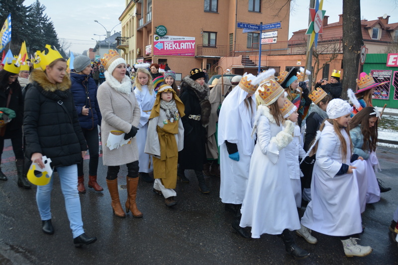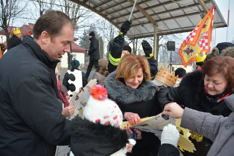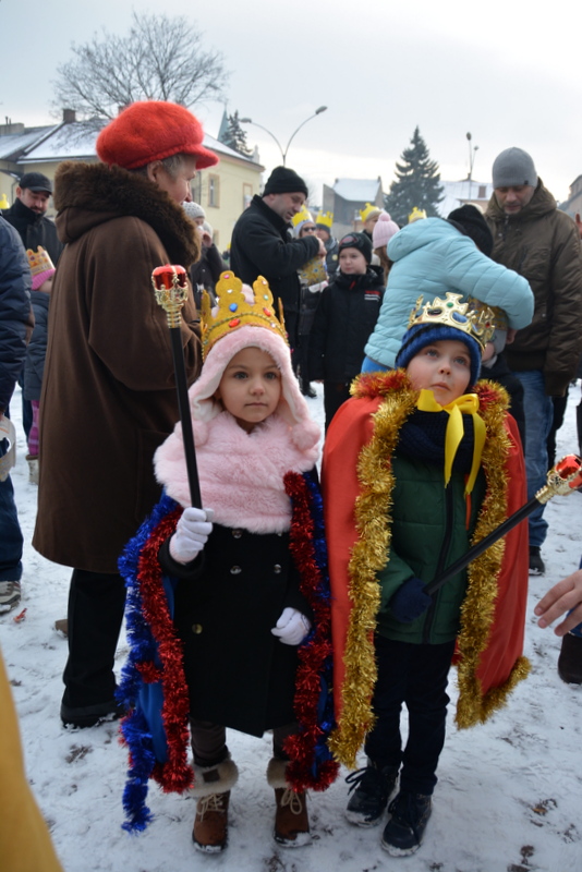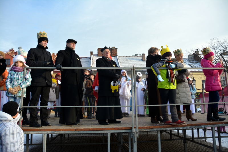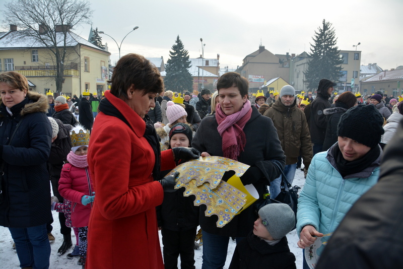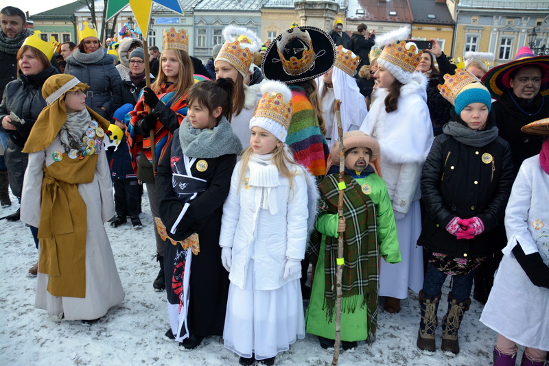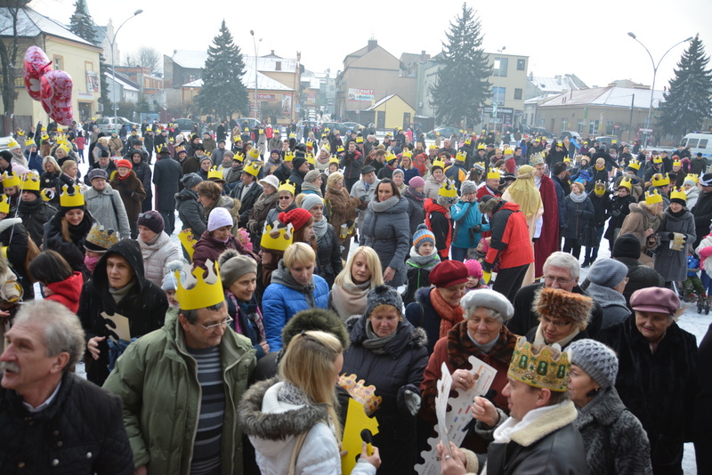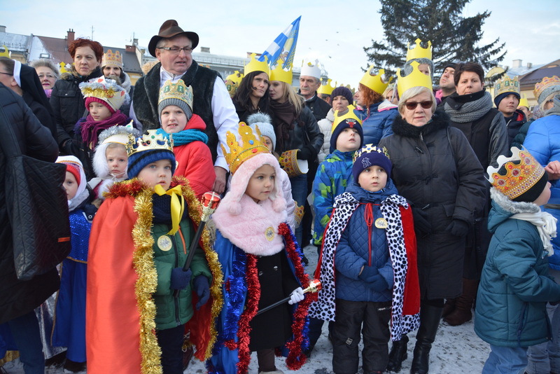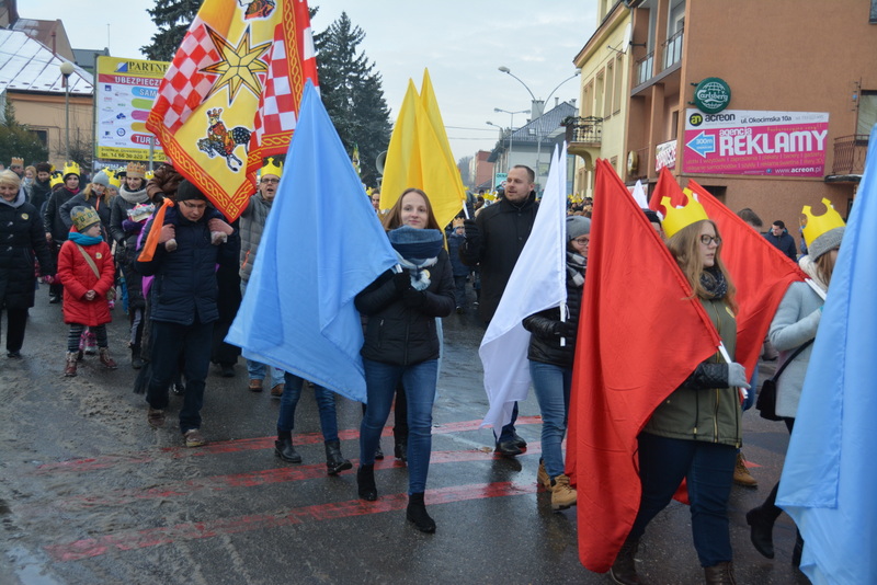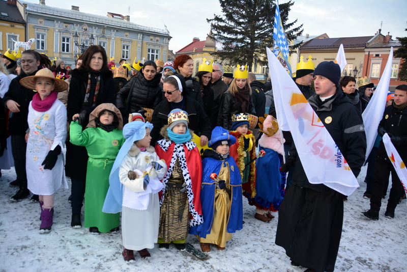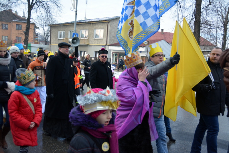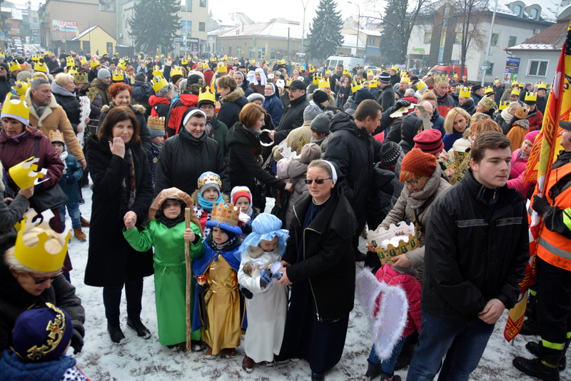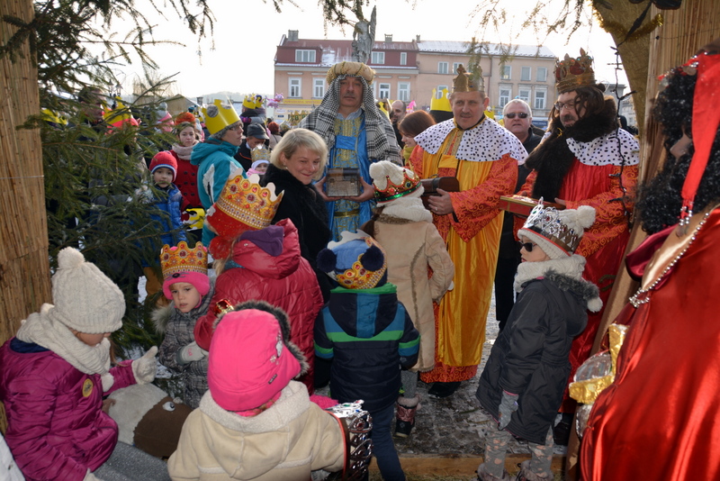 Piękna, słoneczna pogoda powitała w ubiegłą środę uczestników czwartego już Orszaku Trzech Króli w Brzesku.Blisko dwa tysiące ludzi - dzieci i dorosłych, niejednokrotnie w strojach i z koronami na głowach, z gwiazdami i flagami przemaszerowało ulicami Brzeska, śpiewając wspólnie kolędy.Na placu Kazimierza Wielkiego wszystkich przybyłych powitał wiceburmistrz Jerzy Tyrkiel oraz proboszczowie brzeskich parafii - Józef Drabik i Wojciech Werner. Przybyłym rozdano korony, których w tym roku ze względu na bardzo liczną frekwencje zabrakło.W uznaniu pięcioletniego zaangażowania w budowę szopki bożonarodzeniowej, burmistrz Jerzy Tyrkiel wręczył panom: Andrzejowi Grzelakowi, Adamowi Mechelowi, Janowi Michalcowi oraz strażakom OSP Brzesko pamiątkowe akwarele z widokami Brzeska. Wśród wyróżnionych znaleźli się również panowie Jerzy Rybicki i Eugeniusz Kopacz.Pochód rozpoczął się występem na placu Kazimierza - królowie Kacper, Melchior i Baltazar czyli Henryk Piela, Piotr Wyczesany i Janusz Duda po wygłoszeniu swoich kwestii zaprosili zebranych do pochodu. Na jego czele stanęli także Herod- Stanisława Kita i diabeł- Łukasz Kornaś.Orszak poprowadziła Miejska Orkiestra Dęta, tuż za nimi maszerowali królowie, grupy misyjne, wolontariusze Światowych Dni Młodzieży z flagami, strażacy OSP Brzesko z megafonami, mieszkańcy i przybyli turyści. Orkiestra grała pod batutą Wiesława Porwisza, a radny i zarazem król-Piotr Wyczesany prowadził wspólne śpiewanie kolęd. Radosny orszak dotarł do szopki betlejemskiej na rynku, gdzie młodzież z Jadownik pod kierunkiem Elżbiety Loranty wystawiła krótkie jasełka. Znakomicie zaprezentowała się z kolędami grupa śpiewacza Zespołu Pieśni i Tańca Porębianie. Uczestnicy orszaku byli też pod wrażeniem układu artystycznego z flagami przygotowanego przez brzeskich wolontariuszy ŚDM.Bezpieczeństwo przemarszu zapewniali policjanci z wydziału ruchu drogowego komendy powiatowej policji z insp. Bogusławem Barusiem na czele, a obsługę techniczną orszaku sprawowali strażacy OSP Brzesko, pracownicy Miejskiego Ośrodka Kultury i Brzeskich Zakładów Komunalnych.-Dziękujemy panu burmistrzowi Grzegorzowi Wawryce za tę cenną inicjatywę wspólnego świętowania. Spotkajmy się za rok, a każdy z nas niech przyprowadzi przynajmniej jedną osobę na orszak - powiedzieli na zakończenie proboszczowie Józef Drabik i Wojciech Werner.
