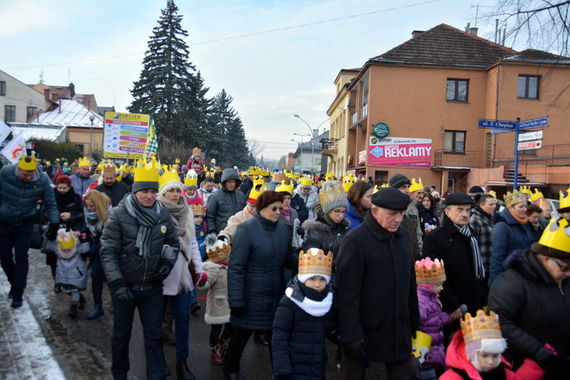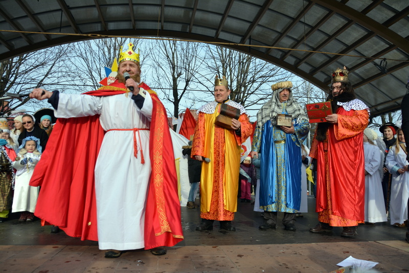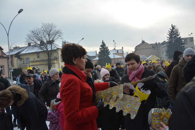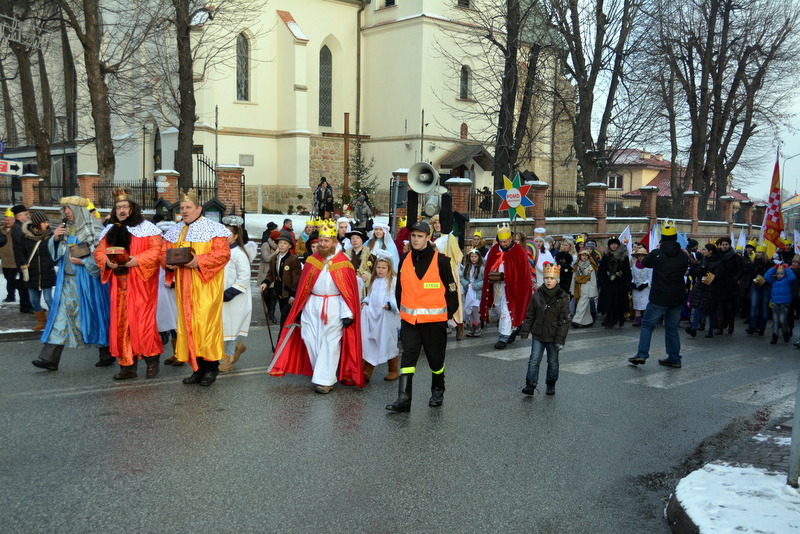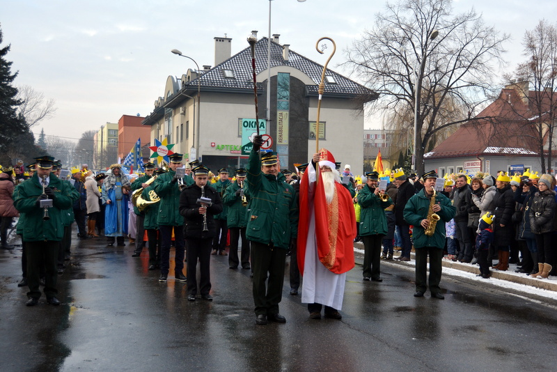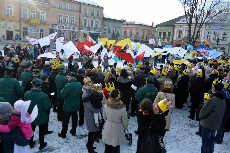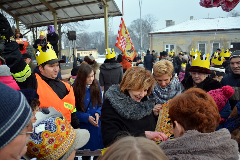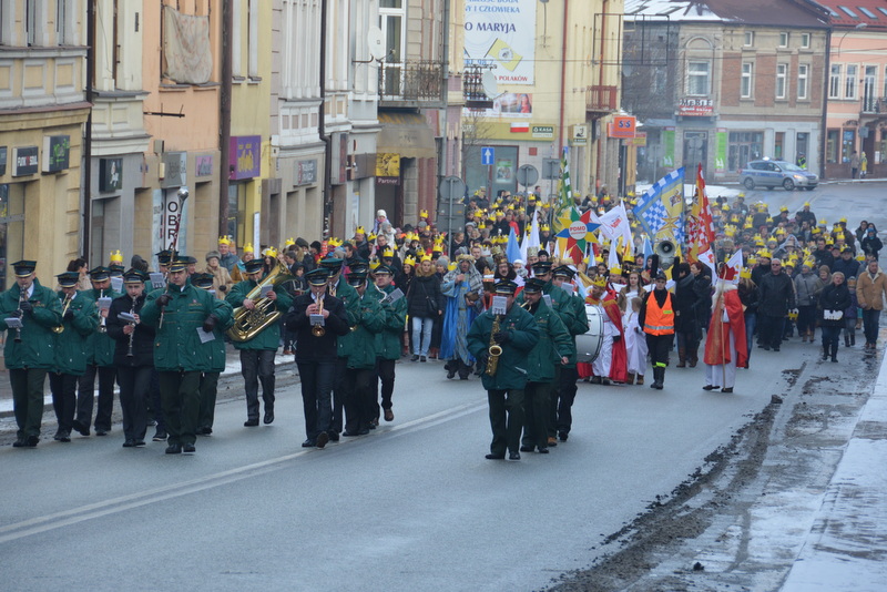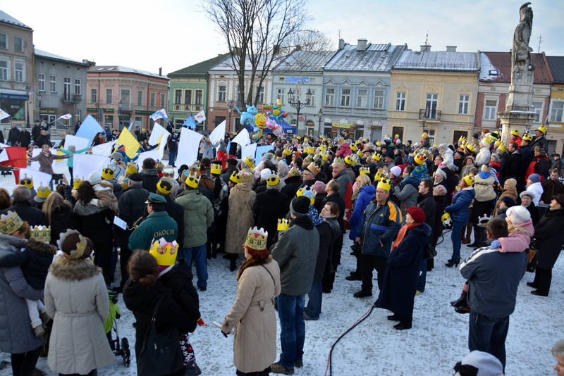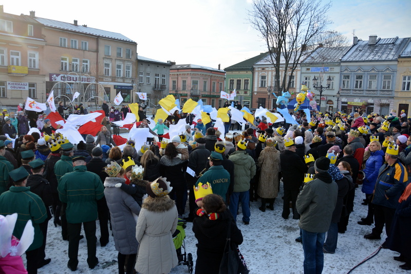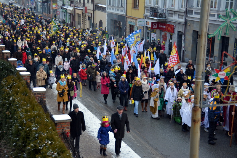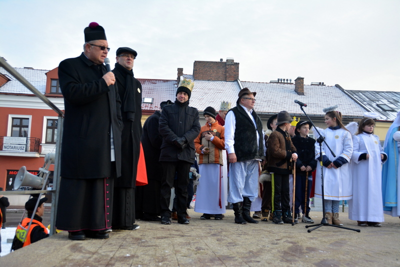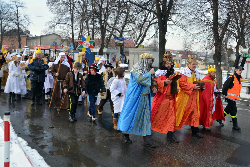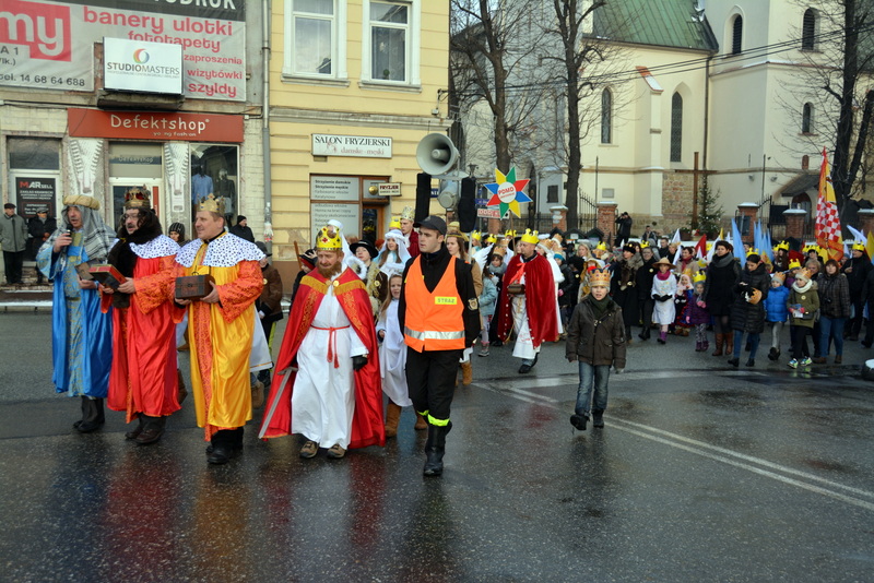 Piękna, słoneczna pogoda powitała w ubiegłą środę uczestników czwartego już Orszaku Trzech Króli w Brzesku.Blisko dwa tysiące ludzi - dzieci i dorosłych, niejednokrotnie w strojach i z koronami na głowach, z gwiazdami i flagami przemaszerowało ulicami Brzeska, śpiewając wspólnie kolędy.Na placu Kazimierza Wielkiego wszystkich przybyłych powitał wiceburmistrz Jerzy Tyrkiel oraz proboszczowie brzeskich parafii - Józef Drabik i Wojciech Werner. Przybyłym rozdano korony, których w tym roku ze względu na bardzo liczną frekwencje zabrakło.W uznaniu pięcioletniego zaangażowania w budowę szopki bożonarodzeniowej, burmistrz Jerzy Tyrkiel wręczył panom: Andrzejowi Grzelakowi, Adamowi Mechelowi, Janowi Michalcowi oraz strażakom OSP Brzesko pamiątkowe akwarele z widokami Brzeska. Wśród wyróżnionych znaleźli się również panowie Jerzy Rybicki i Eugeniusz Kopacz.Pochód rozpoczął się występem na placu Kazimierza - królowie Kacper, Melchior i Baltazar czyli Henryk Piela, Piotr Wyczesany i Janusz Duda po wygłoszeniu swoich kwestii zaprosili zebranych do pochodu. Na jego czele stanęli także Herod- Stanisława Kita i diabeł- Łukasz Kornaś.Orszak poprowadziła Miejska Orkiestra Dęta, tuż za nimi maszerowali królowie, grupy misyjne, wolontariusze Światowych Dni Młodzieży z flagami, strażacy OSP Brzesko z megafonami, mieszkańcy i przybyli turyści. Orkiestra grała pod batutą Wiesława Porwisza, a radny i zarazem król-Piotr Wyczesany prowadził wspólne śpiewanie kolęd. Radosny orszak dotarł do szopki betlejemskiej na rynku, gdzie młodzież z Jadownik pod kierunkiem Elżbiety Loranty wystawiła krótkie jasełka. Znakomicie zaprezentowała się z kolędami grupa śpiewacza Zespołu Pieśni i Tańca Porębianie. Uczestnicy orszaku byli też pod wrażeniem układu artystycznego z flagami przygotowanego przez brzeskich wolontariuszy ŚDM.Bezpieczeństwo przemarszu zapewniali policjanci z wydziału ruchu drogowego komendy powiatowej policji z insp. Bogusławem Barusiem na czele, a obsługę techniczną orszaku sprawowali strażacy OSP Brzesko, pracownicy Miejskiego Ośrodka Kultury i Brzeskich Zakładów Komunalnych.-Dziękujemy panu burmistrzowi Grzegorzowi Wawryce za tę cenną inicjatywę wspólnego świętowania. Spotkajmy się za rok, a każdy z nas niech przyprowadzi przynajmniej jedną osobę na orszak - powiedzieli na zakończenie proboszczowie Józef Drabik i Wojciech Werner.