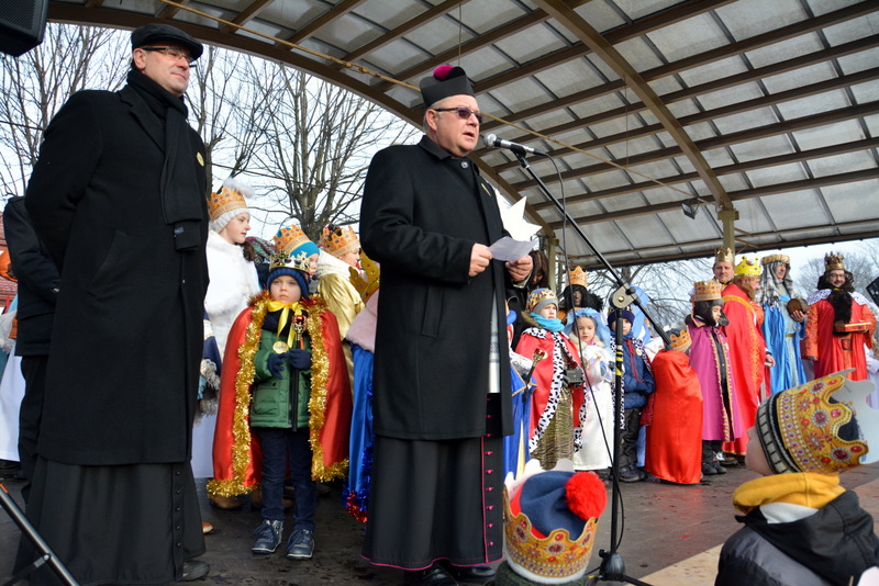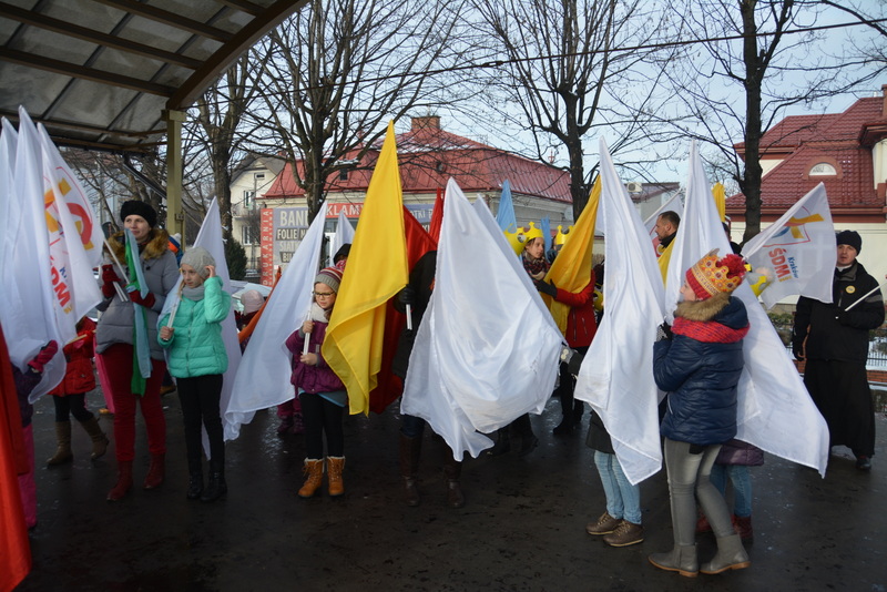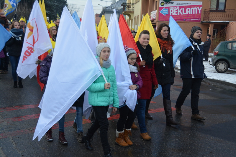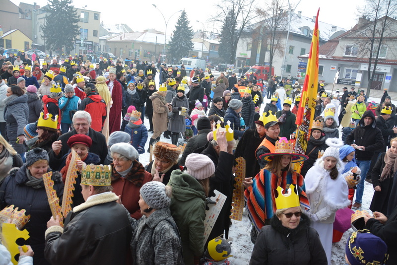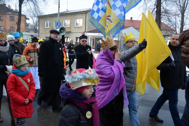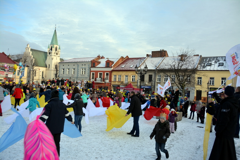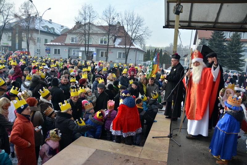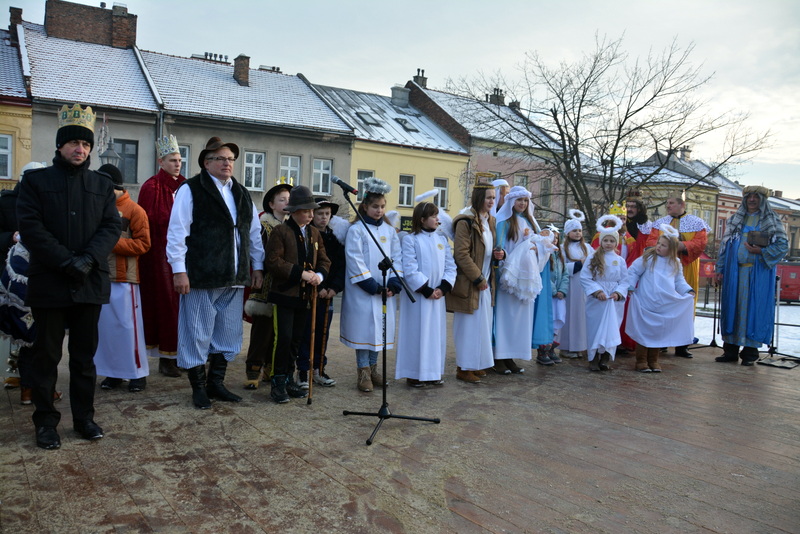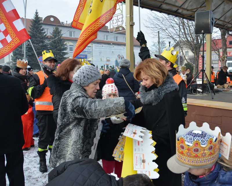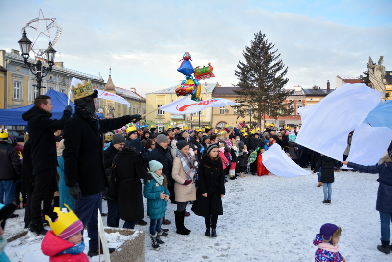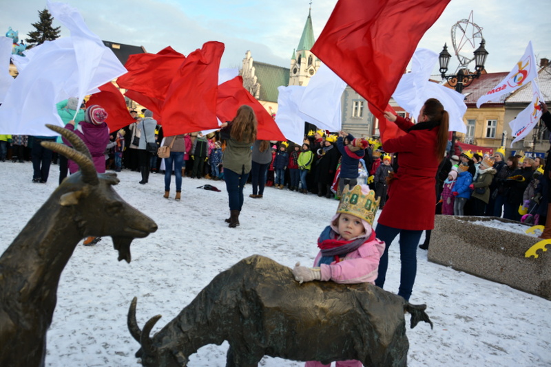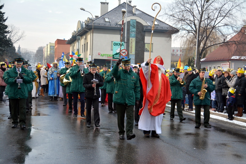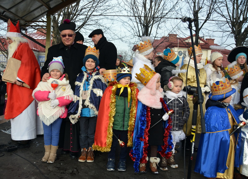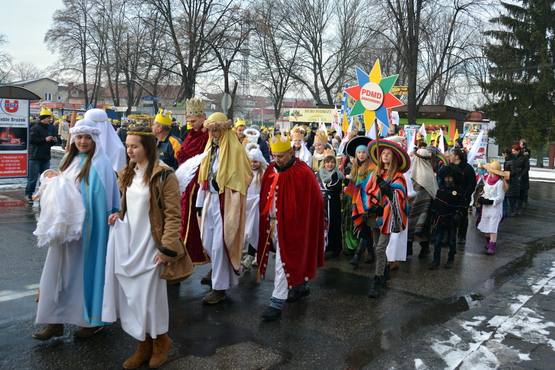 Piękna, słoneczna pogoda powitała w ubiegłą środę uczestników czwartego już Orszaku Trzech Króli w Brzesku.Blisko dwa tysiące ludzi - dzieci i dorosłych, niejednokrotnie w strojach i z koronami na głowach, z gwiazdami i flagami przemaszerowało ulicami Brzeska, śpiewając wspólnie kolędy.Na placu Kazimierza Wielkiego wszystkich przybyłych powitał wiceburmistrz Jerzy Tyrkiel oraz proboszczowie brzeskich parafii - Józef Drabik i Wojciech Werner. Przybyłym rozdano korony, których w tym roku ze względu na bardzo liczną frekwencje zabrakło.W uznaniu pięcioletniego zaangażowania w budowę szopki bożonarodzeniowej, burmistrz Jerzy Tyrkiel wręczył panom: Andrzejowi Grzelakowi, Adamowi Mechelowi, Janowi Michalcowi oraz strażakom OSP Brzesko pamiątkowe akwarele z widokami Brzeska. Wśród wyróżnionych znaleźli się również panowie Jerzy Rybicki i Eugeniusz Kopacz.Pochód rozpoczął się występem na placu Kazimierza - królowie Kacper, Melchior i Baltazar czyli Henryk Piela, Piotr Wyczesany i Janusz Duda po wygłoszeniu swoich kwestii zaprosili zebranych do pochodu. Na jego czele stanęli także Herod- Stanisława Kita i diabeł- Łukasz Kornaś.Orszak poprowadziła Miejska Orkiestra Dęta, tuż za nimi maszerowali królowie, grupy misyjne, wolontariusze Światowych Dni Młodzieży z flagami, strażacy OSP Brzesko z megafonami, mieszkańcy i przybyli turyści. Orkiestra grała pod batutą Wiesława Porwisza, a radny i zarazem król-Piotr Wyczesany prowadził wspólne śpiewanie kolęd. Radosny orszak dotarł do szopki betlejemskiej na rynku, gdzie młodzież z Jadownik pod kierunkiem Elżbiety Loranty wystawiła krótkie jasełka. Znakomicie zaprezentowała się z kolędami grupa śpiewacza Zespołu Pieśni i Tańca Porębianie. Uczestnicy orszaku byli też pod wrażeniem układu artystycznego z flagami przygotowanego przez brzeskich wolontariuszy ŚDM.Bezpieczeństwo przemarszu zapewniali policjanci z wydziału ruchu drogowego komendy powiatowej policji z insp. Bogusławem Barusiem na czele, a obsługę techniczną orszaku sprawowali strażacy OSP Brzesko, pracownicy Miejskiego Ośrodka Kultury i Brzeskich Zakładów Komunalnych.-Dziękujemy panu burmistrzowi Grzegorzowi Wawryce za tę cenną inicjatywę wspólnego świętowania. Spotkajmy się za rok, a każdy z nas niech przyprowadzi przynajmniej jedną osobę na orszak - powiedzieli na zakończenie proboszczowie Józef Drabik i Wojciech Werner.