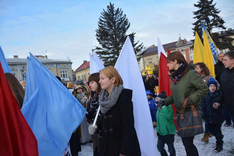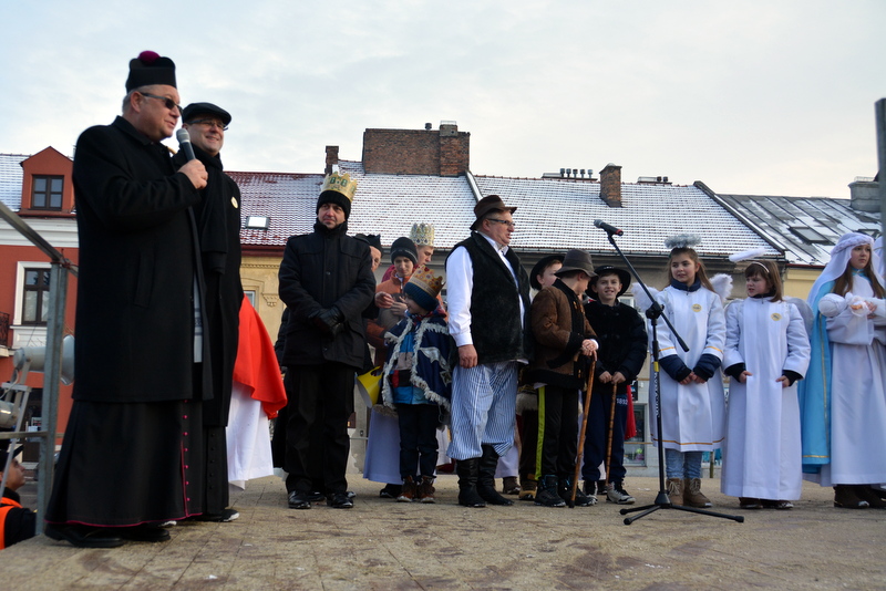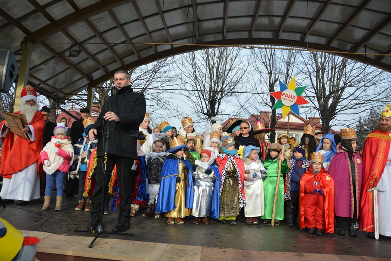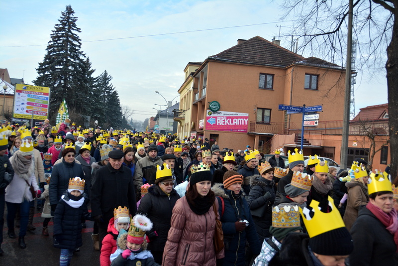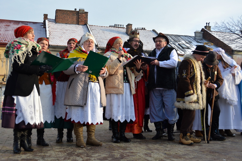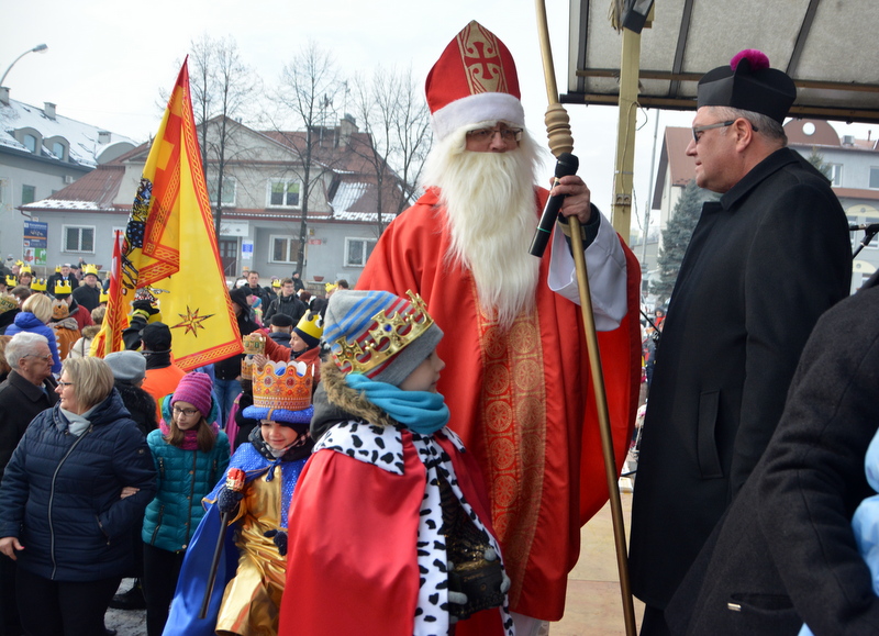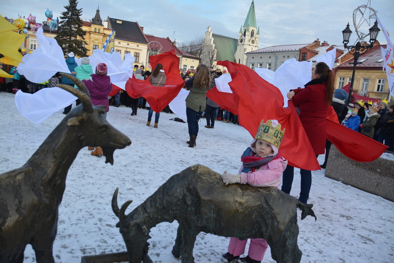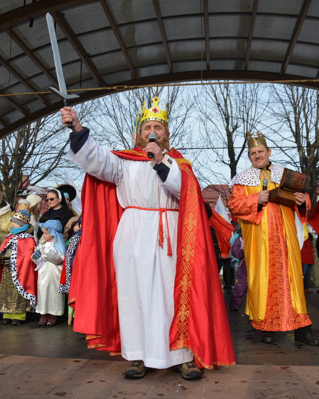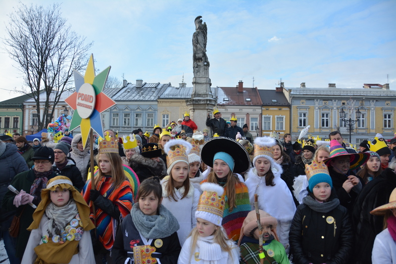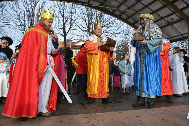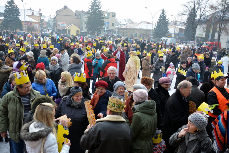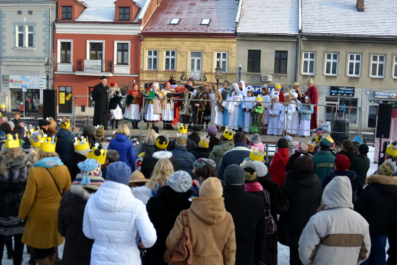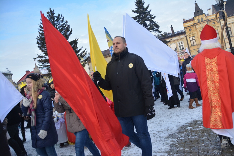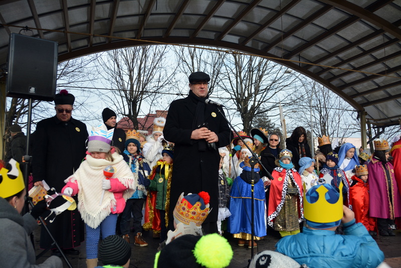 Piękna, słoneczna pogoda powitała w ubiegłą środę uczestników czwartego już Orszaku Trzech Króli w Brzesku.Blisko dwa tysiące ludzi - dzieci i dorosłych, niejednokrotnie w strojach i z koronami na głowach, z gwiazdami i flagami przemaszerowało ulicami Brzeska, śpiewając wspólnie kolędy.Na placu Kazimierza Wielkiego wszystkich przybyłych powitał wiceburmistrz Jerzy Tyrkiel oraz proboszczowie brzeskich parafii - Józef Drabik i Wojciech Werner. Przybyłym rozdano korony, których w tym roku ze względu na bardzo liczną frekwencje zabrakło.W uznaniu pięcioletniego zaangażowania w budowę szopki bożonarodzeniowej, burmistrz Jerzy Tyrkiel wręczył panom: Andrzejowi Grzelakowi, Adamowi Mechelowi, Janowi Michalcowi oraz strażakom OSP Brzesko pamiątkowe akwarele z widokami Brzeska. Wśród wyróżnionych znaleźli się również panowie Jerzy Rybicki i Eugeniusz Kopacz.Pochód rozpoczął się występem na placu Kazimierza - królowie Kacper, Melchior i Baltazar czyli Henryk Piela, Piotr Wyczesany i Janusz Duda po wygłoszeniu swoich kwestii zaprosili zebranych do pochodu. Na jego czele stanęli także Herod- Stanisława Kita i diabeł- Łukasz Kornaś.Orszak poprowadziła Miejska Orkiestra Dęta, tuż za nimi maszerowali królowie, grupy misyjne, wolontariusze Światowych Dni Młodzieży z flagami, strażacy OSP Brzesko z megafonami, mieszkańcy i przybyli turyści. Orkiestra grała pod batutą Wiesława Porwisza, a radny i zarazem król-Piotr Wyczesany prowadził wspólne śpiewanie kolęd. Radosny orszak dotarł do szopki betlejemskiej na rynku, gdzie młodzież z Jadownik pod kierunkiem Elżbiety Loranty wystawiła krótkie jasełka. Znakomicie zaprezentowała się z kolędami grupa śpiewacza Zespołu Pieśni i Tańca Porębianie. Uczestnicy orszaku byli też pod wrażeniem układu artystycznego z flagami przygotowanego przez brzeskich wolontariuszy ŚDM.Bezpieczeństwo przemarszu zapewniali policjanci z wydziału ruchu drogowego komendy powiatowej policji z insp. Bogusławem Barusiem na czele, a obsługę techniczną orszaku sprawowali strażacy OSP Brzesko, pracownicy Miejskiego Ośrodka Kultury i Brzeskich Zakładów Komunalnych.-Dziękujemy panu burmistrzowi Grzegorzowi Wawryce za tę cenną inicjatywę wspólnego świętowania. Spotkajmy się za rok, a każdy z nas niech przyprowadzi przynajmniej jedną osobę na orszak - powiedzieli na zakończenie proboszczowie Józef Drabik i Wojciech Werner.