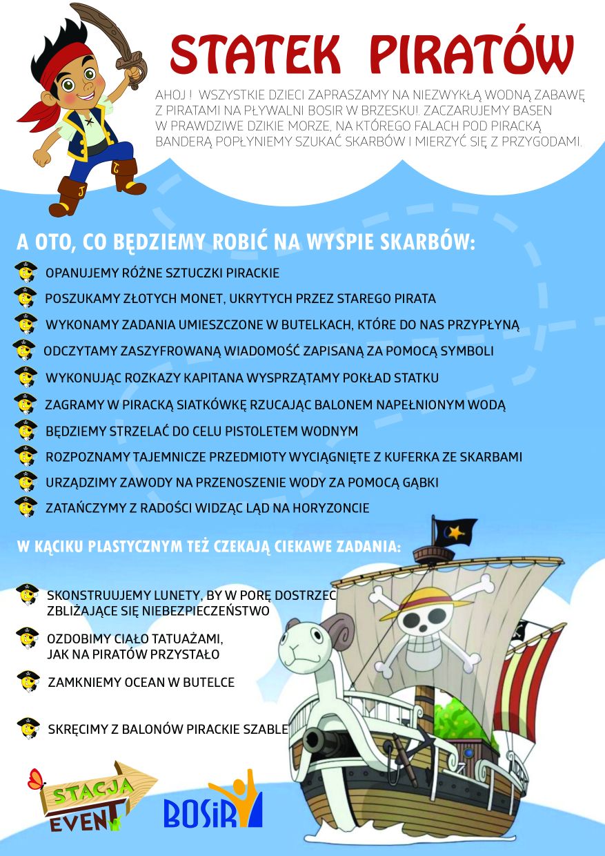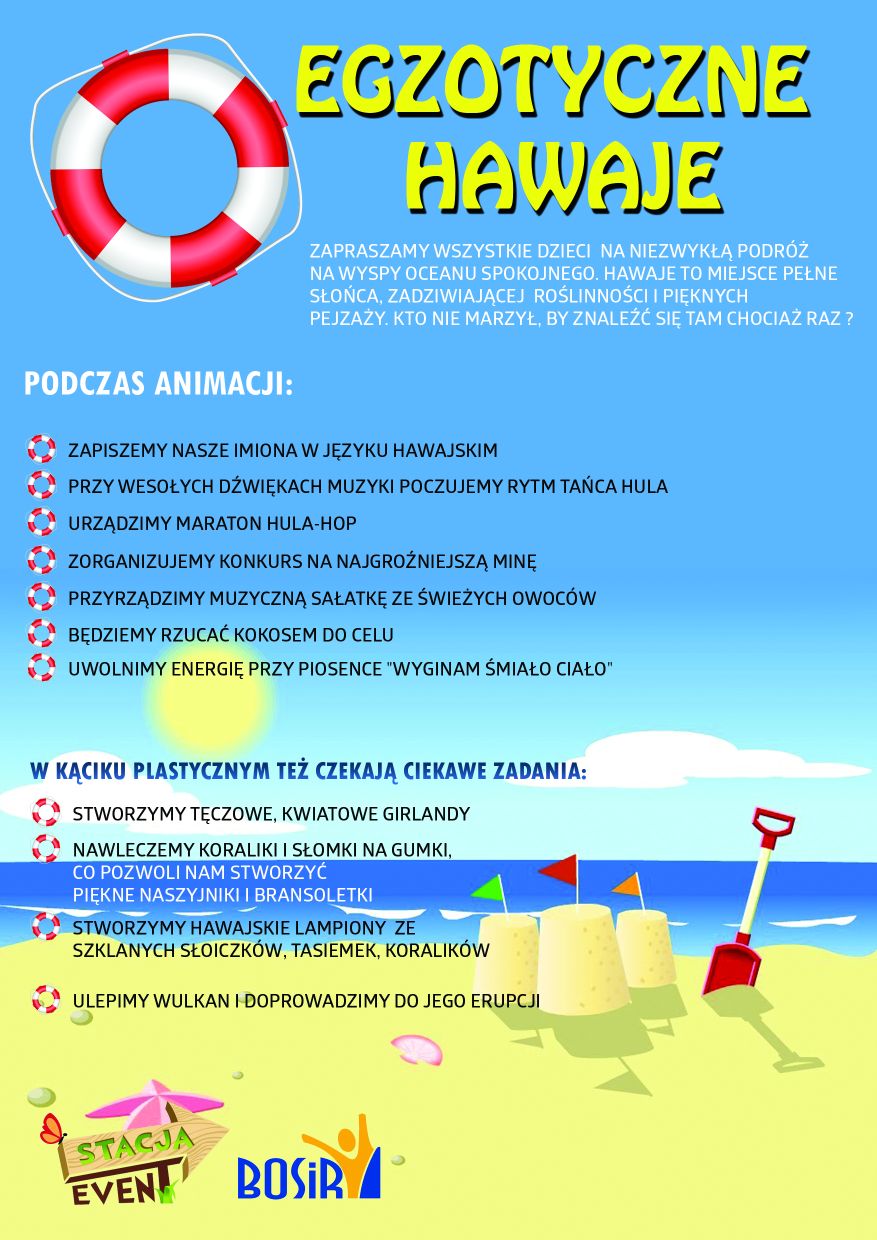 Brzeski Ośrodek Sportu i Rekreacji zaprasza wszystkie dzieci w wieku 5-12 lat na zajęcia, „Animacje tematyczne”, które odbywać się będą podczas nadchodzących ferii na brzeskiej pływalni. Prowadzone będą przez doświadczonych animatorów z „Stacja Ewent”.W środę 20 stycznia brzeski basen zmieni się w prawdziwe dzikie morze, na którym pod piracką banderą młodzi żeglarze popłyną szukać skarbów i mierzyć się z przygodami.W niezwykłą podróż na wyspy oceanu spokojnego organizatorzy zabiorą dzieci 27 stycznia. Wszyscy, którzy marzą odwiedzić Hawaje, miejsce pełne słońca, zadziwiającej roślinności, wraz z wieloma niespodziankami będą mogli to zrobić w ciągu jednego dnia.Dodatkowo w kąciku plastycznym czekają ciekawe zadania, które odbywać się będą na małym basenie w godzinach od 10.00 do 12.00.Serdecznie zapraszamy.