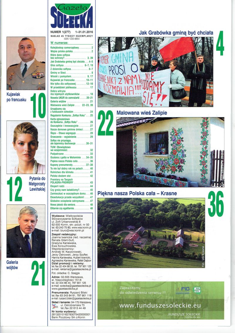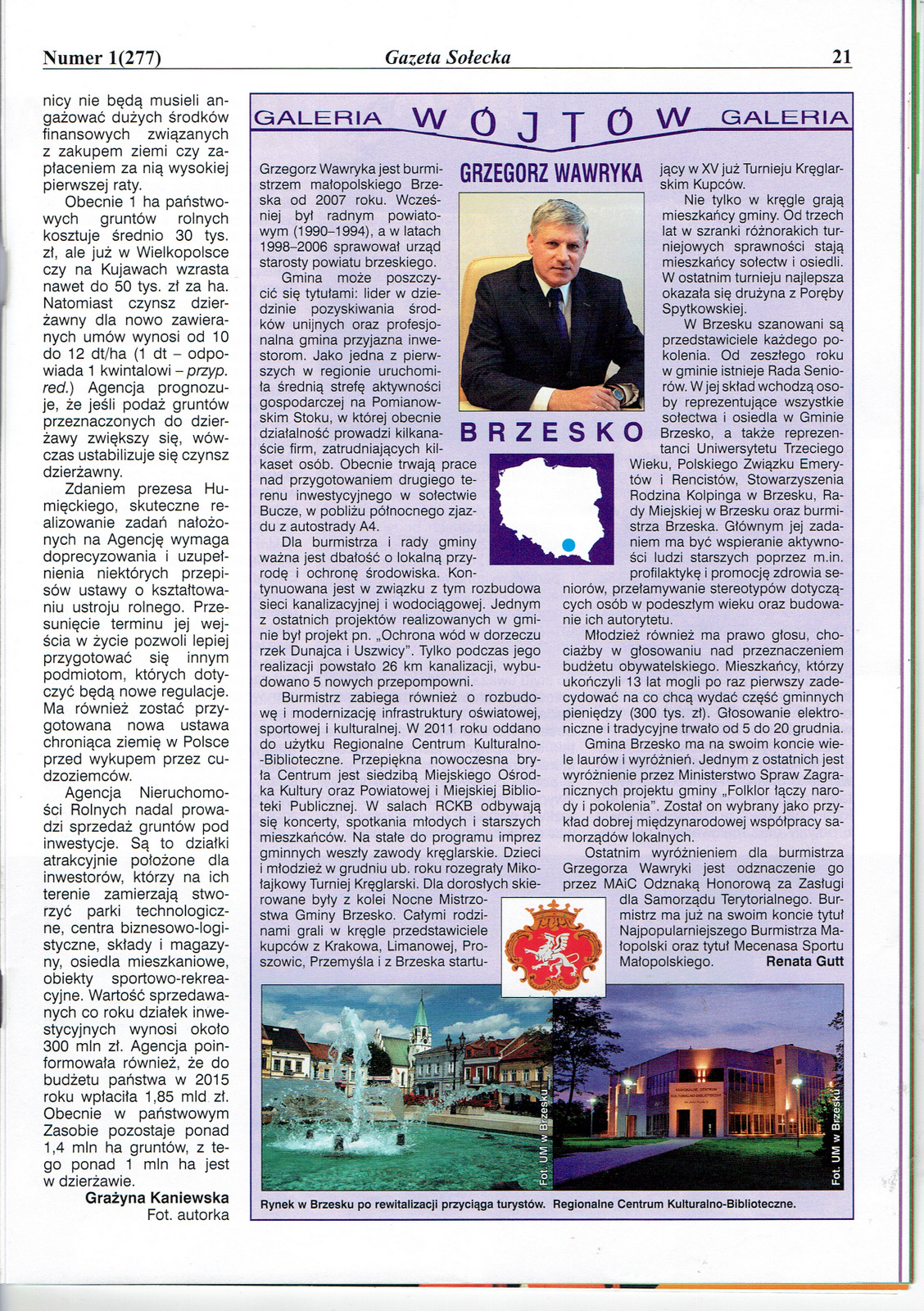 Ogólnopolskie wydawnictwo Krajowego Stowarzyszenia Sołtysów "Gazeta Sołecka” w "galerii wójtów" zamieściła artykuł opisujący sylwetkę burmistrza Grzegorza Wawryki. Cieszy fakt, że instytucja ta doceniła dokonania burmistrza oraz działania samorządu na rzecz mieszkańców.