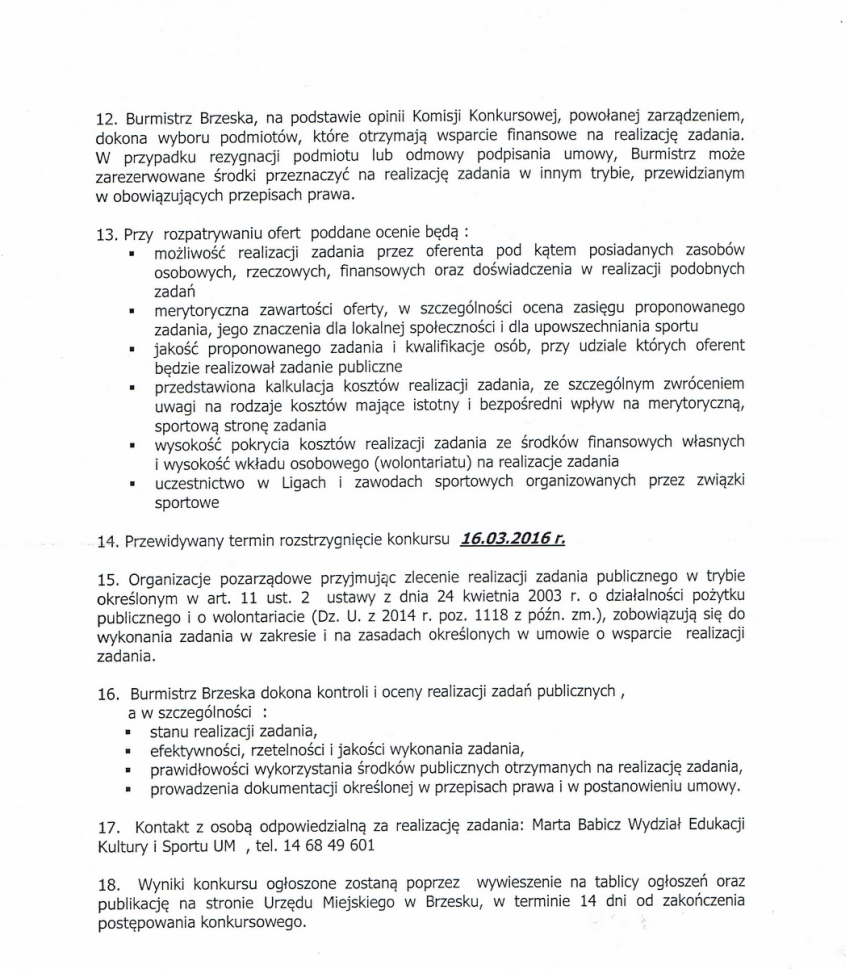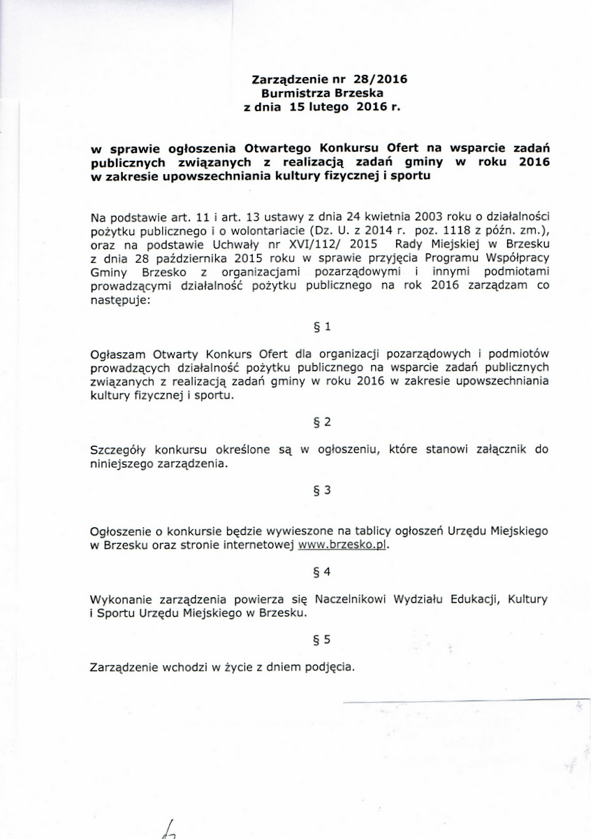 Zarządzenie Nr 28/2016 w sprawie ogłoszenia Otwartego Konkursu Ofert na wsparcie zadań publicznych  związanych z realizacją zadań gminy w roku 2016 w zakresie upowszechniania kultury fizycznej i sportu1234